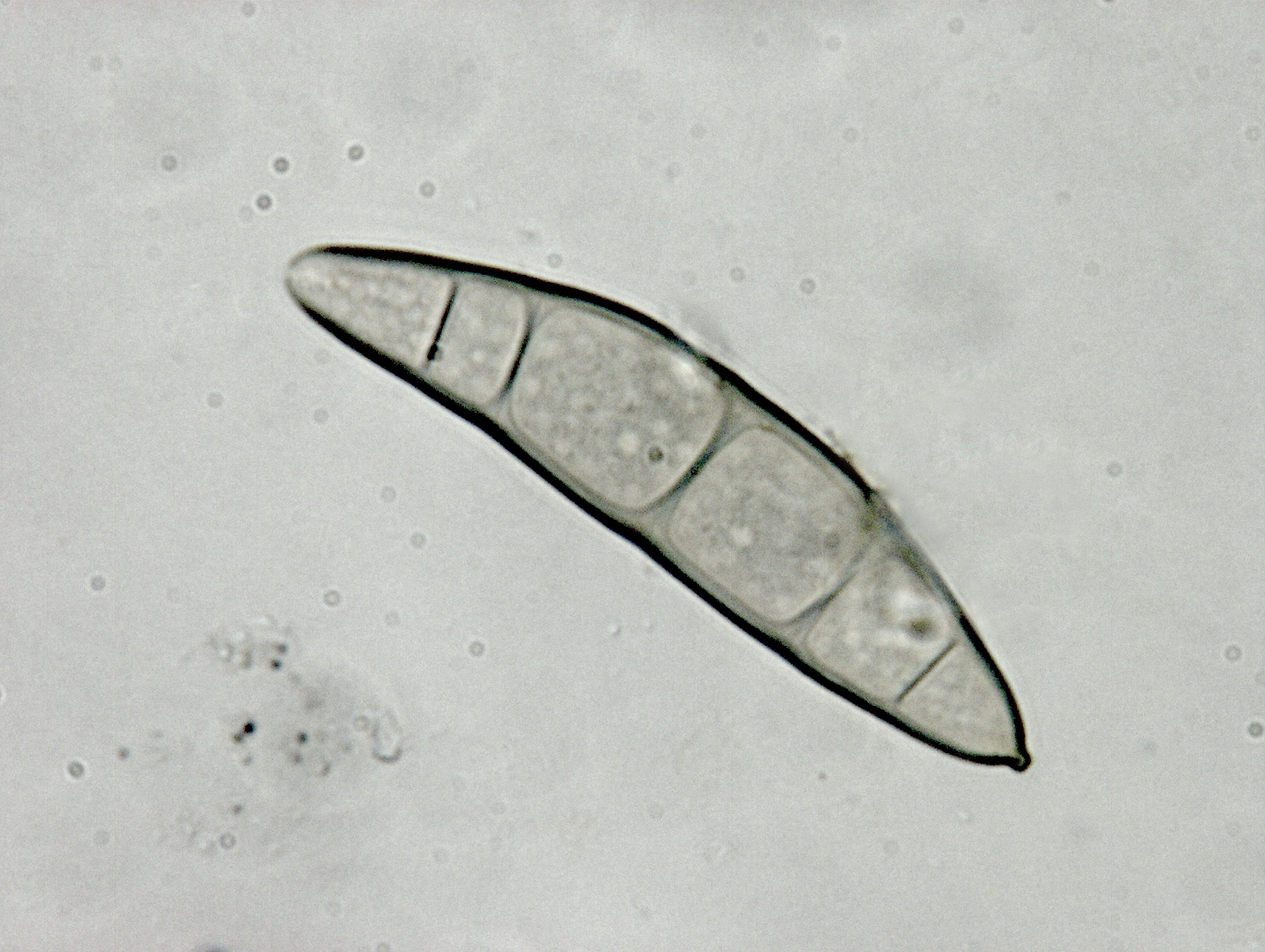 Une conidie d'Exserohilum turcicum avec hile proéminent bien visible