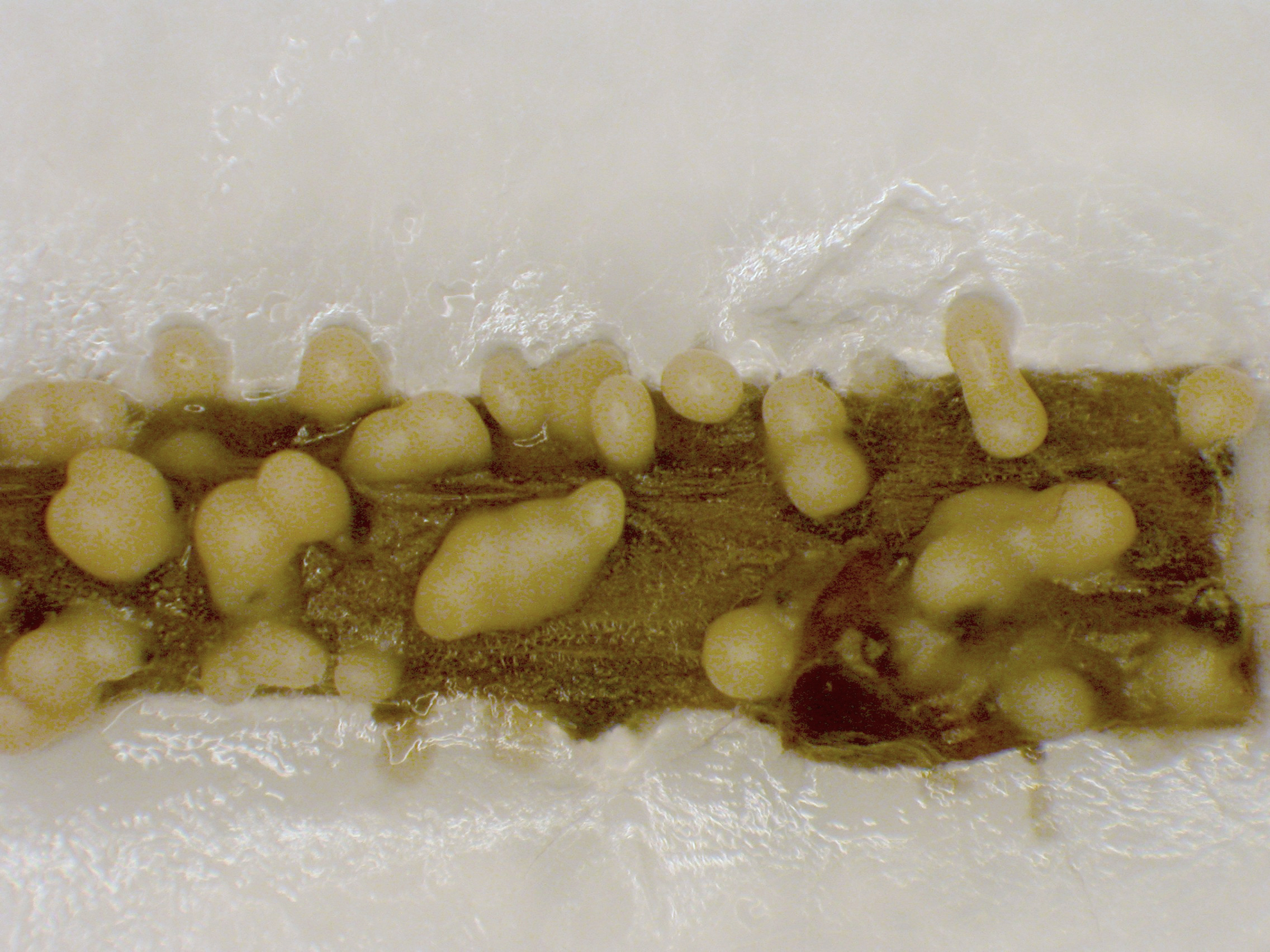 Exsudats jaune-crème de conidies (= mucus globuleux) provenant de pycnides non visibles de Phomopsis sp. recouvrant une pièce végétale déposée sur un milieu de culture gélosé (Stéréomicroscope)