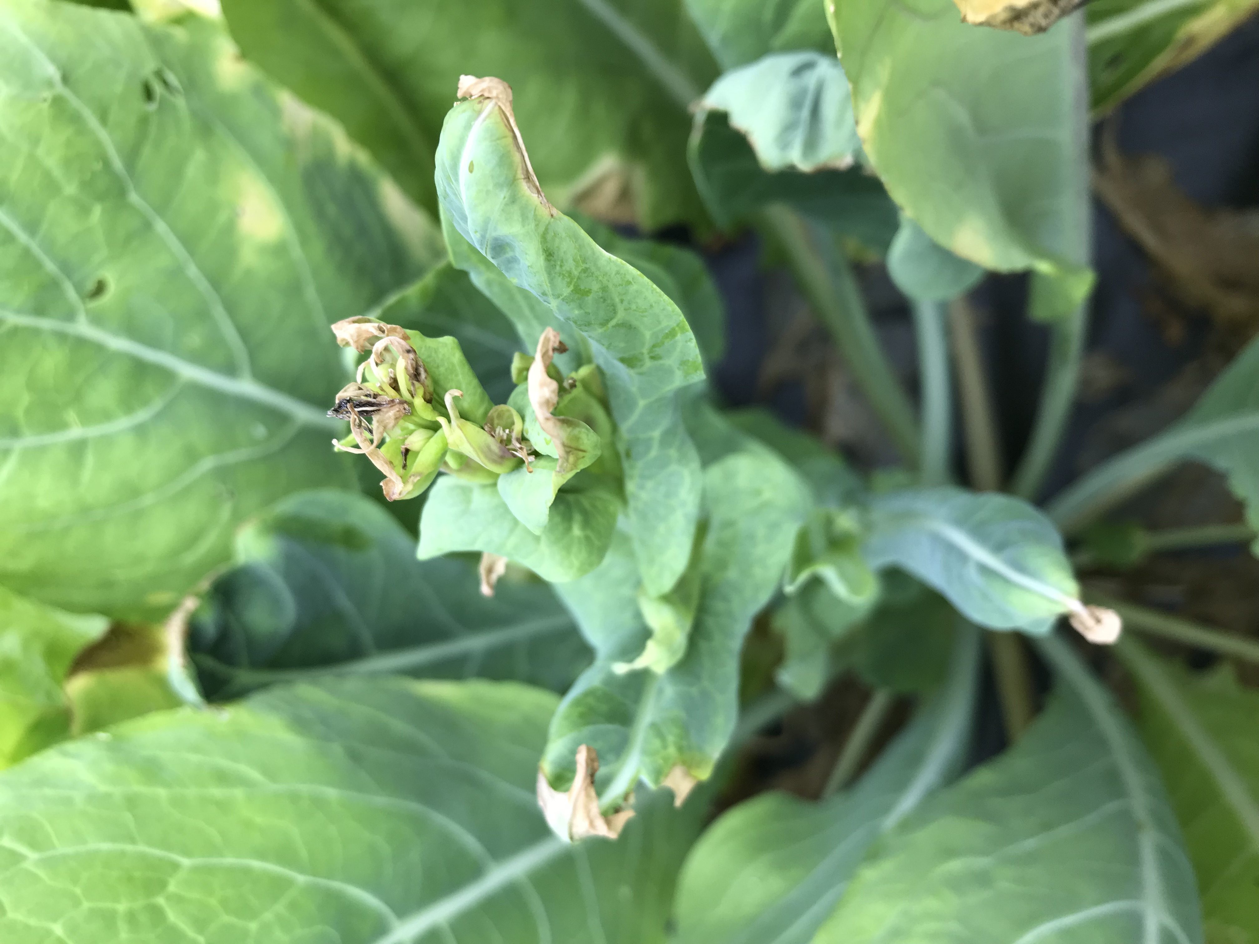 Brûlure et malformation d'une inflorescence de moutarde épinard (komatsuna). Les symptômes sont causés par Xanthomonas campestris pv. campestris, responsable de la nervation noire.
