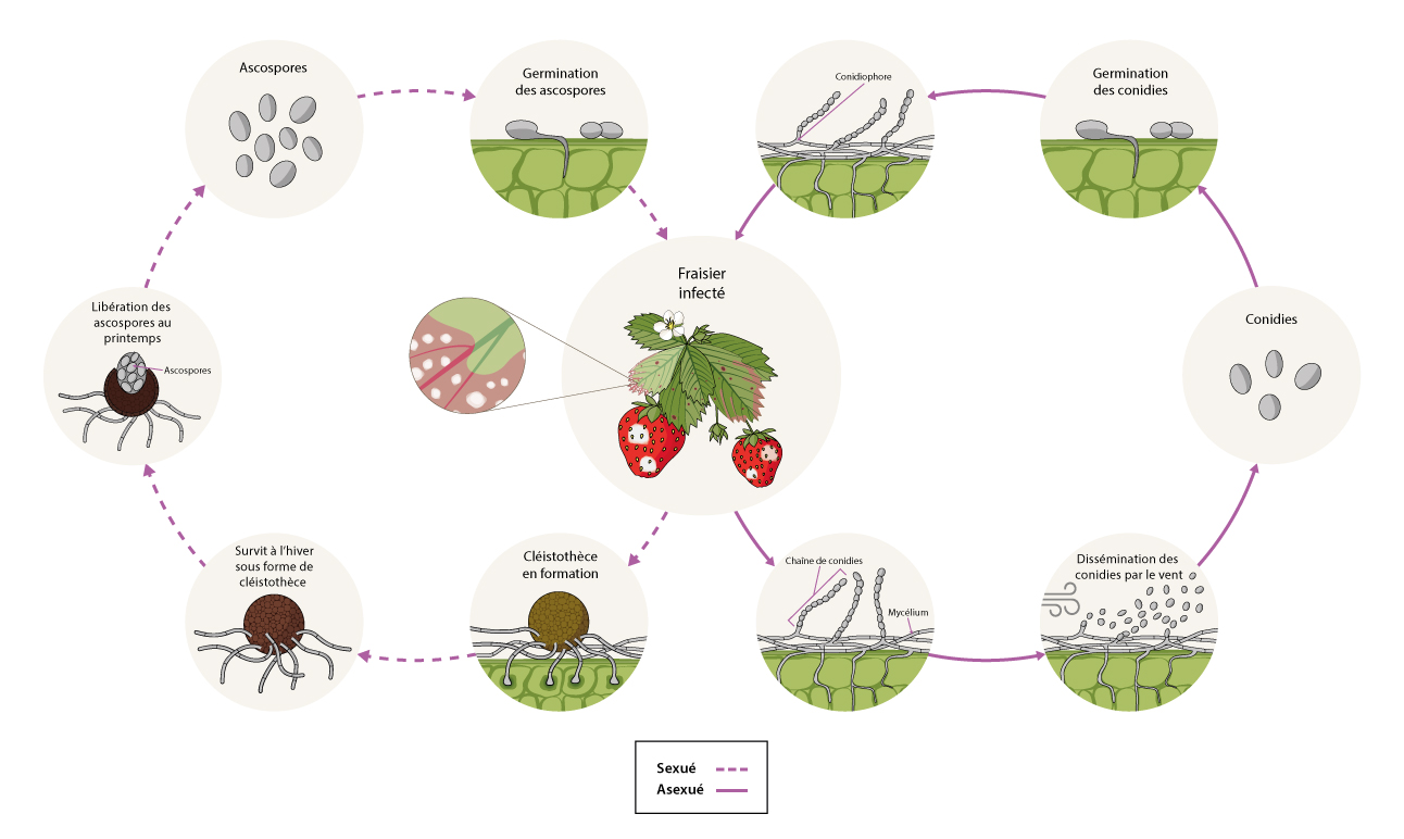 Cycle épidémiologique de Podosphaera aphanis, responsable du blanc chez la fraise.