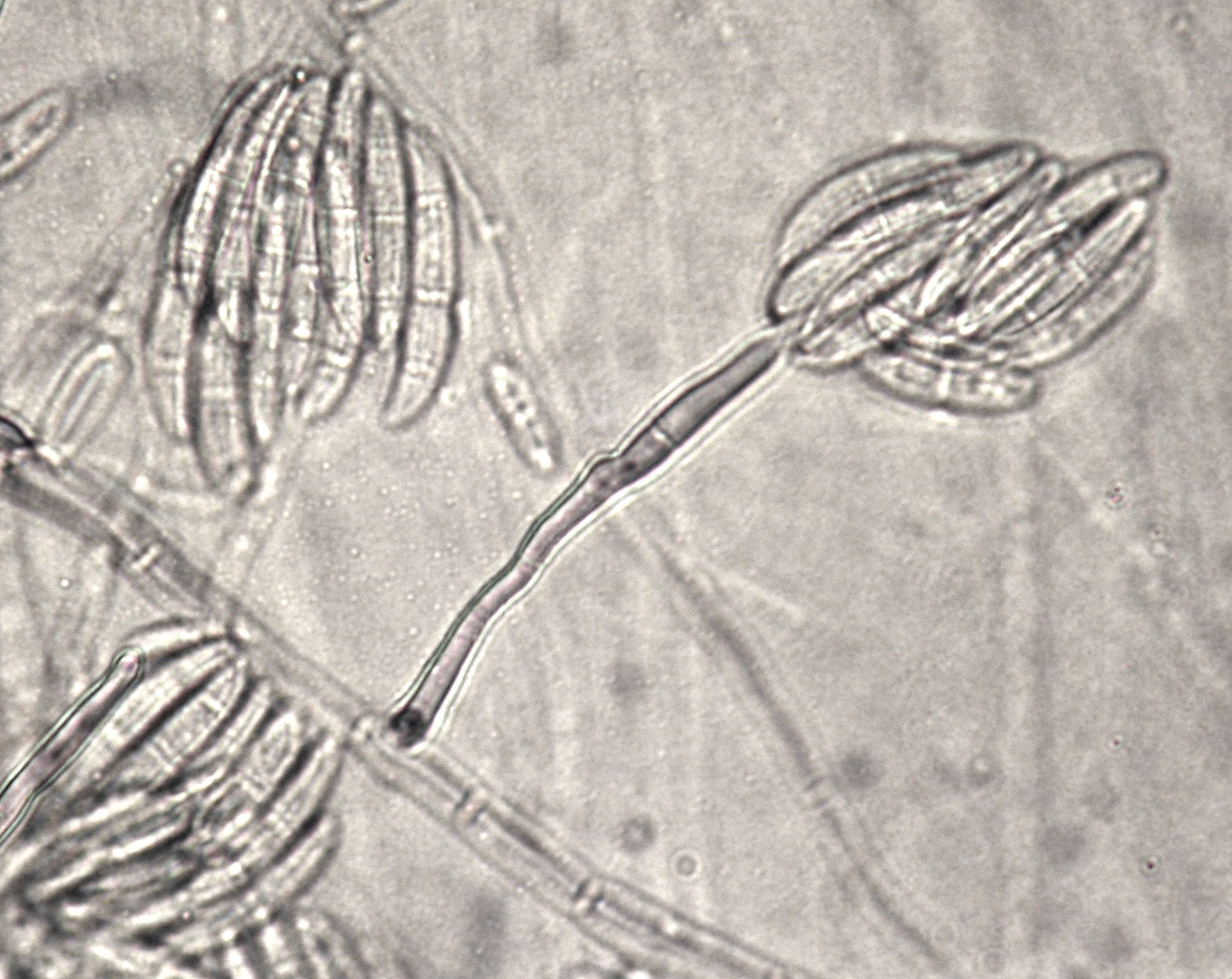 Conidies de Fusarium solani portées sur une longue monophialide.