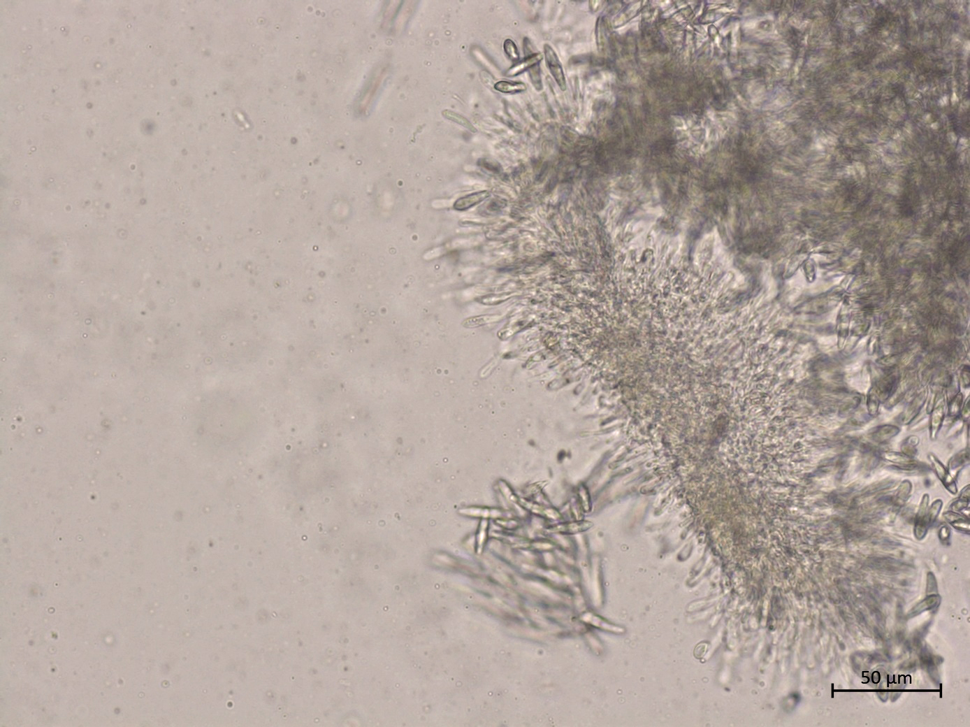 Conidiophores et conidies de Botryosphaeria dothidea.