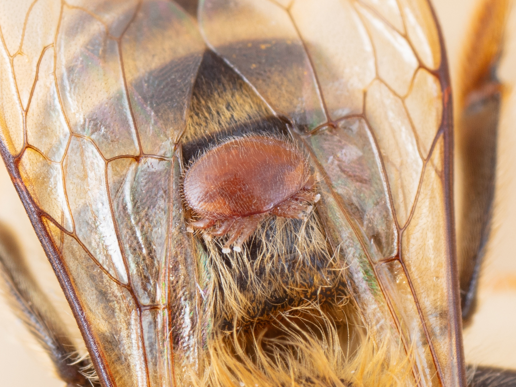 Adulte femelle sur l'abdomen d'une abeille domestique