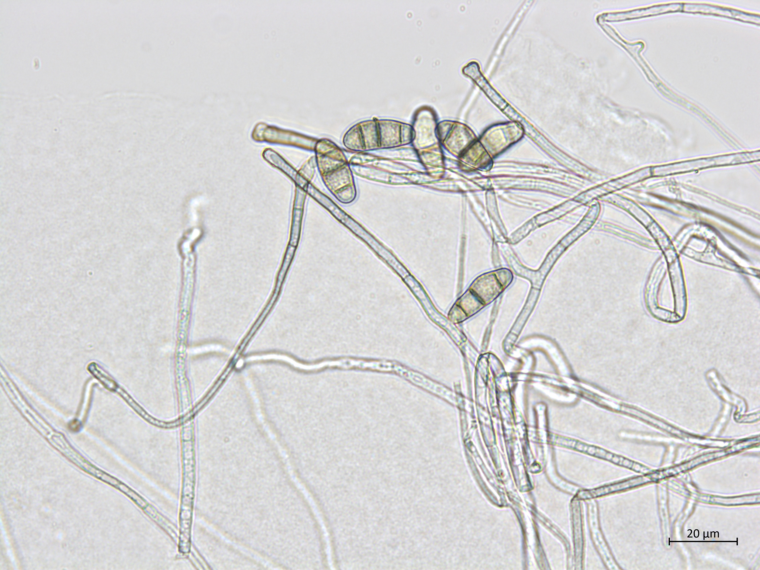 Hyphes et conidies de Curvularia lunata.
