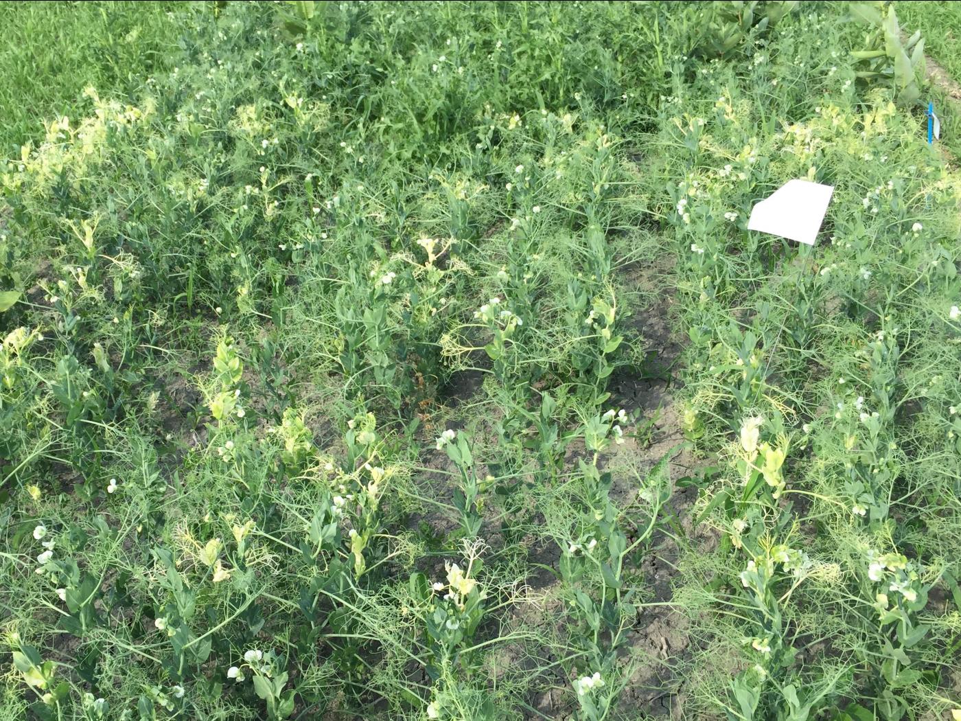 Légende: Jaunissement à blanchiment de la partie aérienne de plants de pois