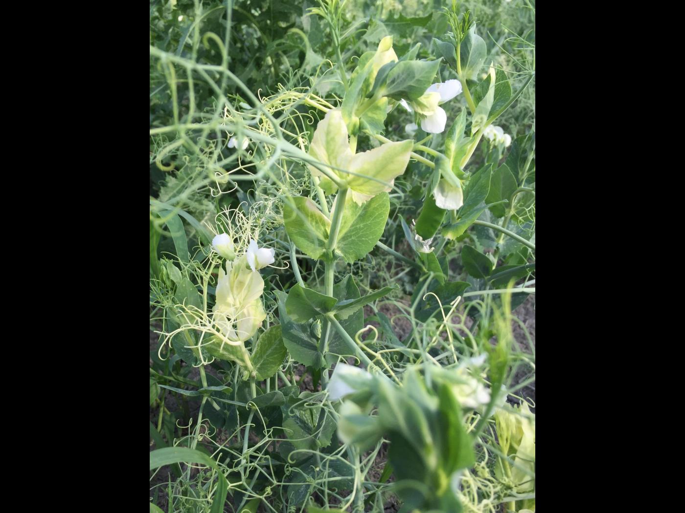 Description: Jaunissement à blanchiment des feuilles terminales et des vrilles du pois (de transformation). Ce symptôme est attribuable à l’application de CALLISTO® 480 SC (mésotrione), à 15% de la dose. Typiquement, les plantes sensibles à la mésotrione présentent un blanchiment (ou un jaunissement) internervaire, suivi d’une nécrose des tissus. L’étiquette du produit mentionne que les cultures sont sensibles à la mésotrione, même à de très faibles concentrations.