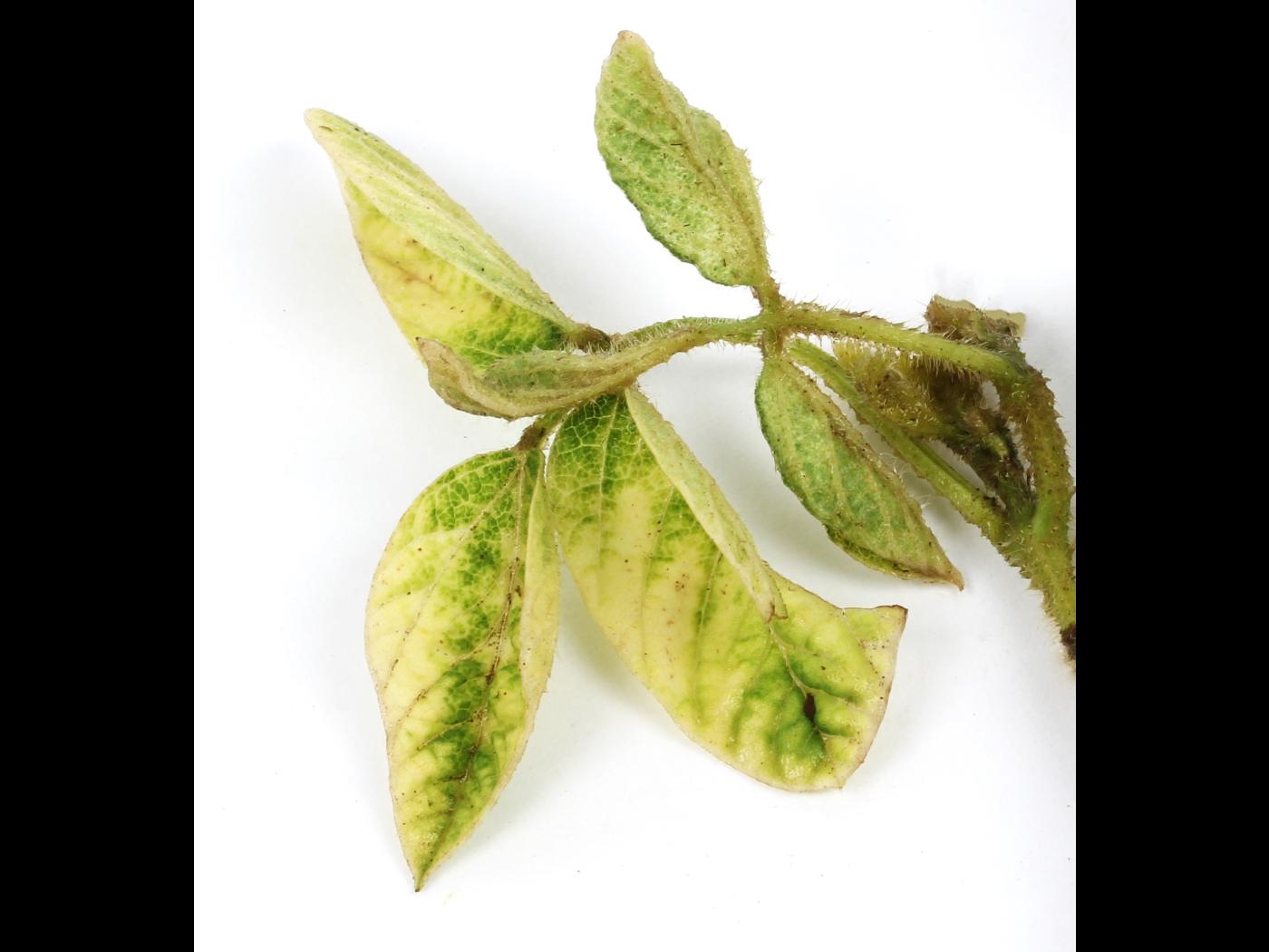 Feuille : blanchiment à jaunissement des tissus foliaires conduisant à des brûlures. Les tissus fortement décolorés peuvent se nécroser.