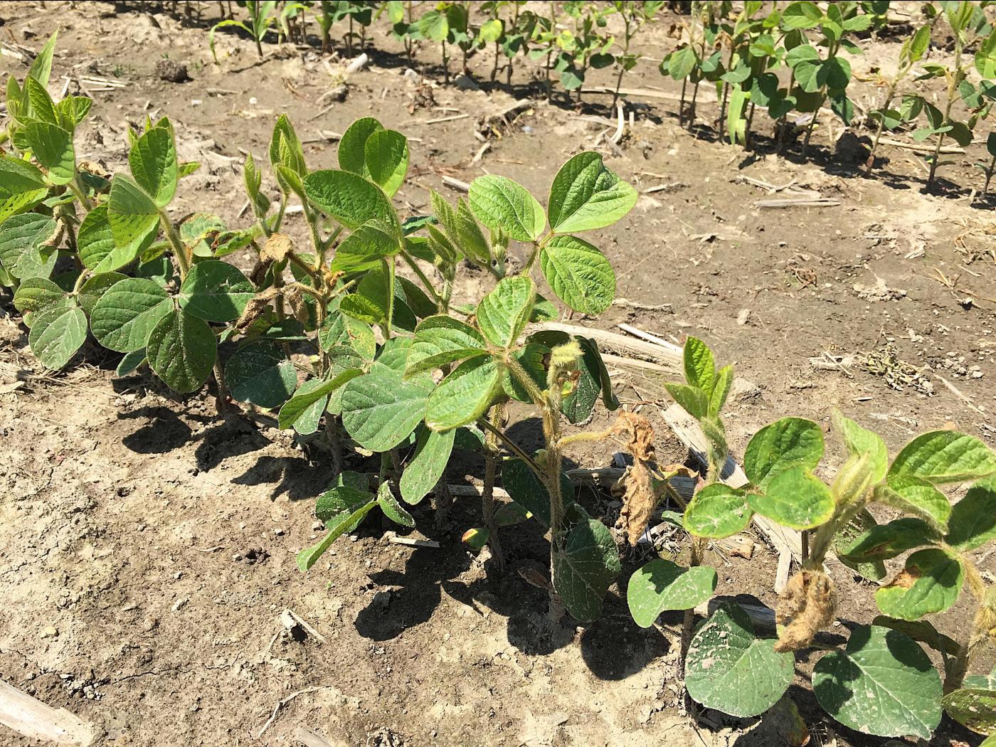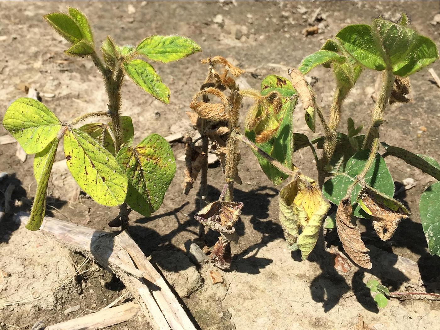 Description: Jaunissement des feuilles terminales de plants de soya. Les feuilles médianes sont complètement brûlées. Ces symptômes sont attribuables à l'application de l'herbicide PURSUIT (imazéthapyr). La dose appliquée est inconnue.