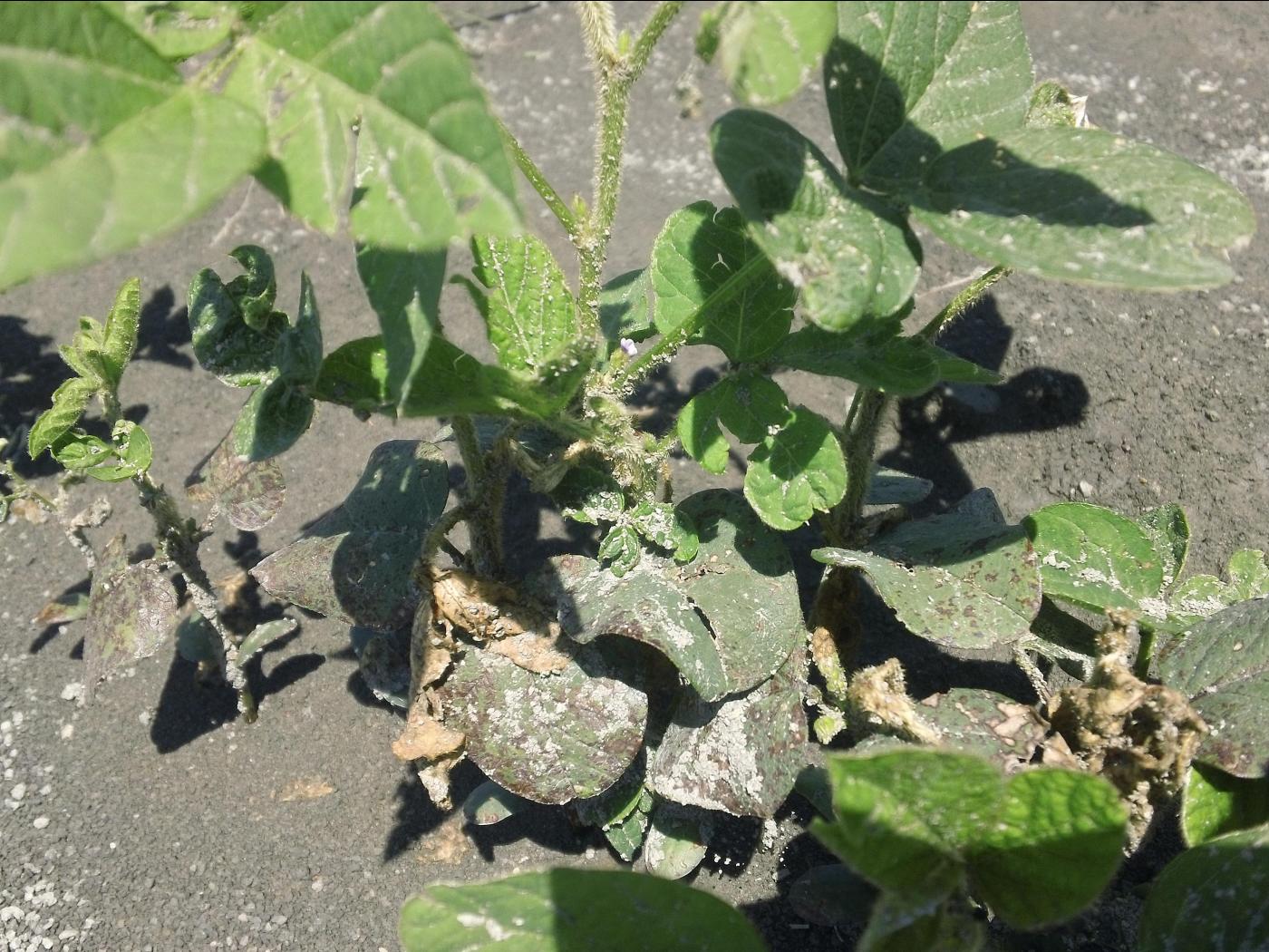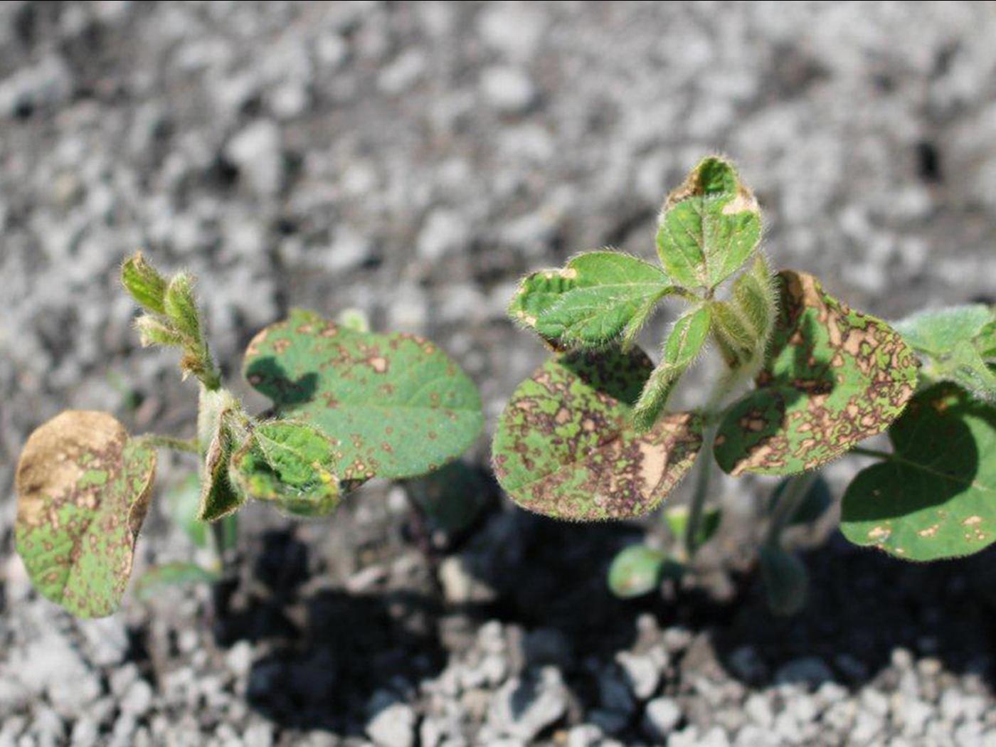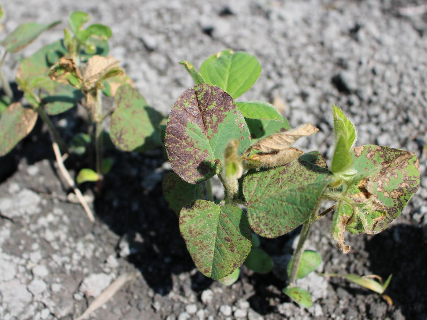 Description: Les feuilles basales et médianes de plants de soya sont partiellement brûlées et présentent de petites taches circulaires, rougeâtres à brunâtres, confluant à plusieurs endroits. Les dommages observés sont le résultat d'une phytotoxicité par le VALTERAMD(flumioxazine), contenu dans l'herbicide GUARDIAN PLUS, appliqué en postlevée de la culture, contrairement à la recommandation de l'étiquette du produit spécifiant que l'application doit être effectuée en prélevée de la culture.