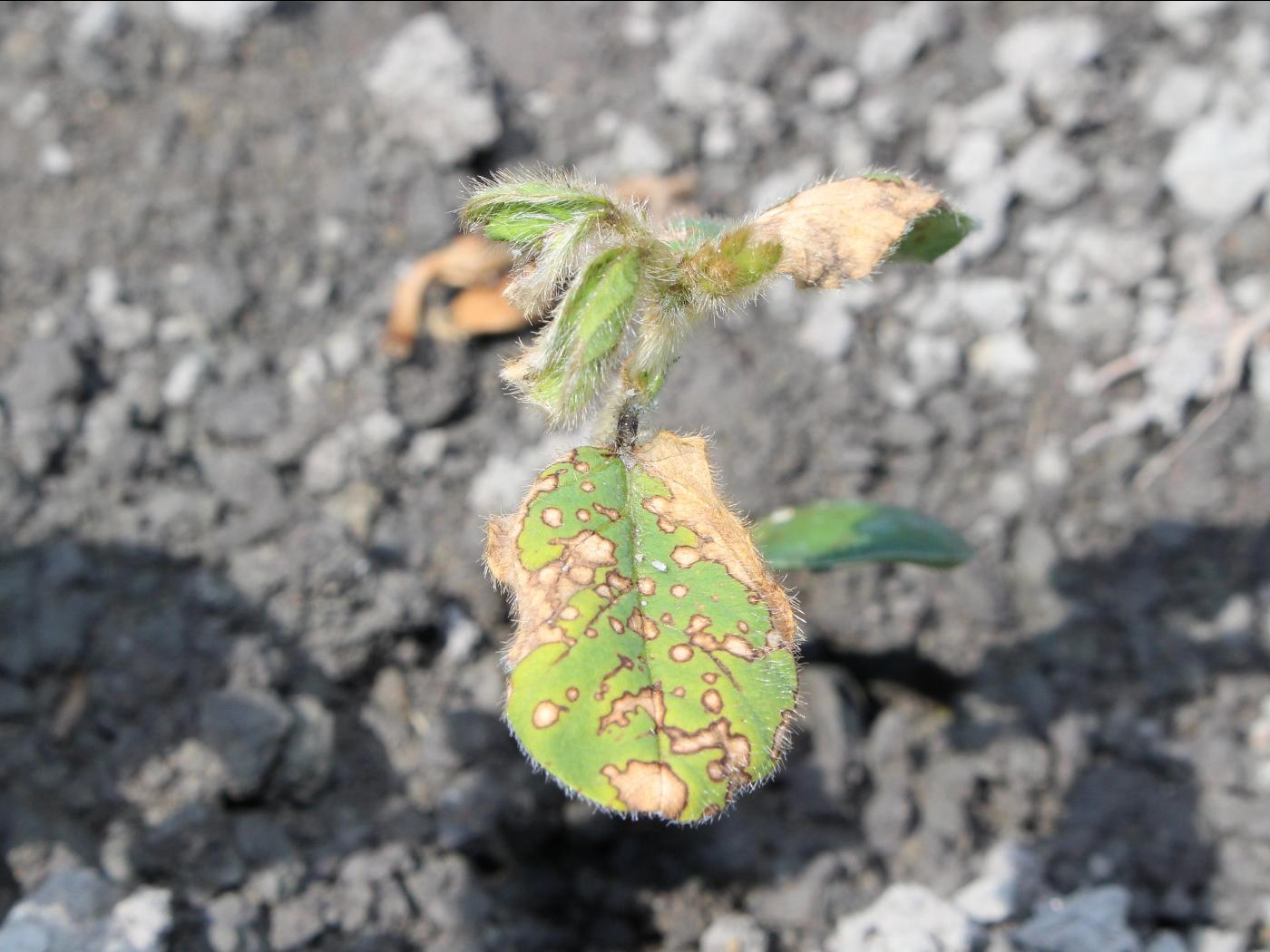 Description: Les feuilles terminales du soya sont complètement brûlées alors que les feuilles médianes présentent de petites taches circulaires, rougeâtres à brunâtres, qui confluent à plusieurs endroits. Les dommages observés sont le résultat d'une phytotoxicité par le VALTERA (flumioxazine), contenu dans l'herbicide GUARDIAN PLUS, appliqué en postlevée de la culture, contrairement à la recommandation de l'étiquette du produit spécifiant que l'application doit être effectuée en prélevée de la culture.