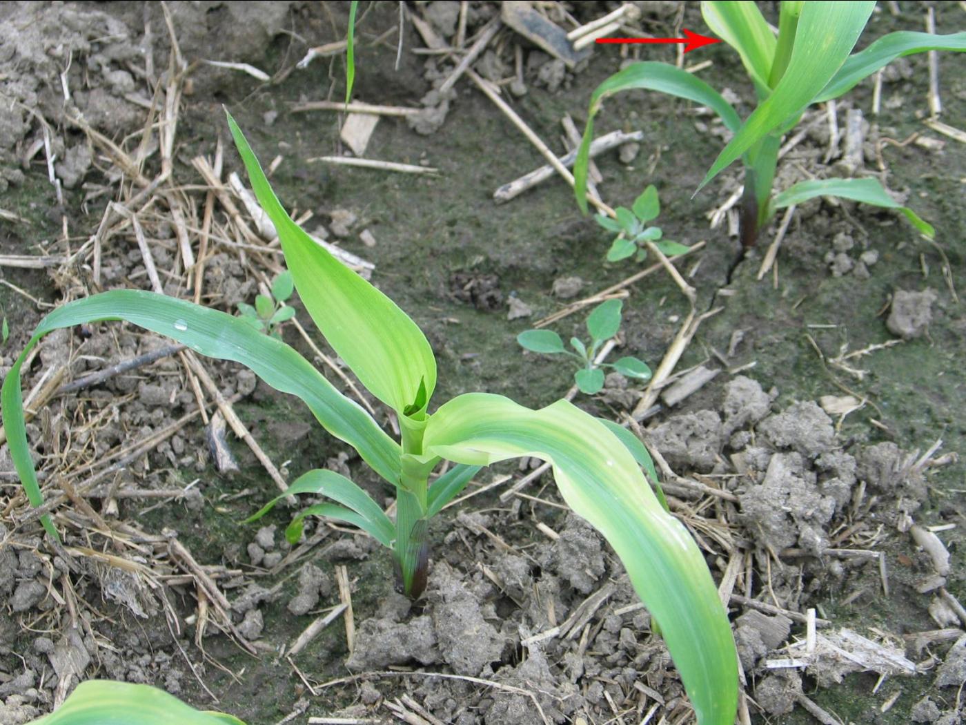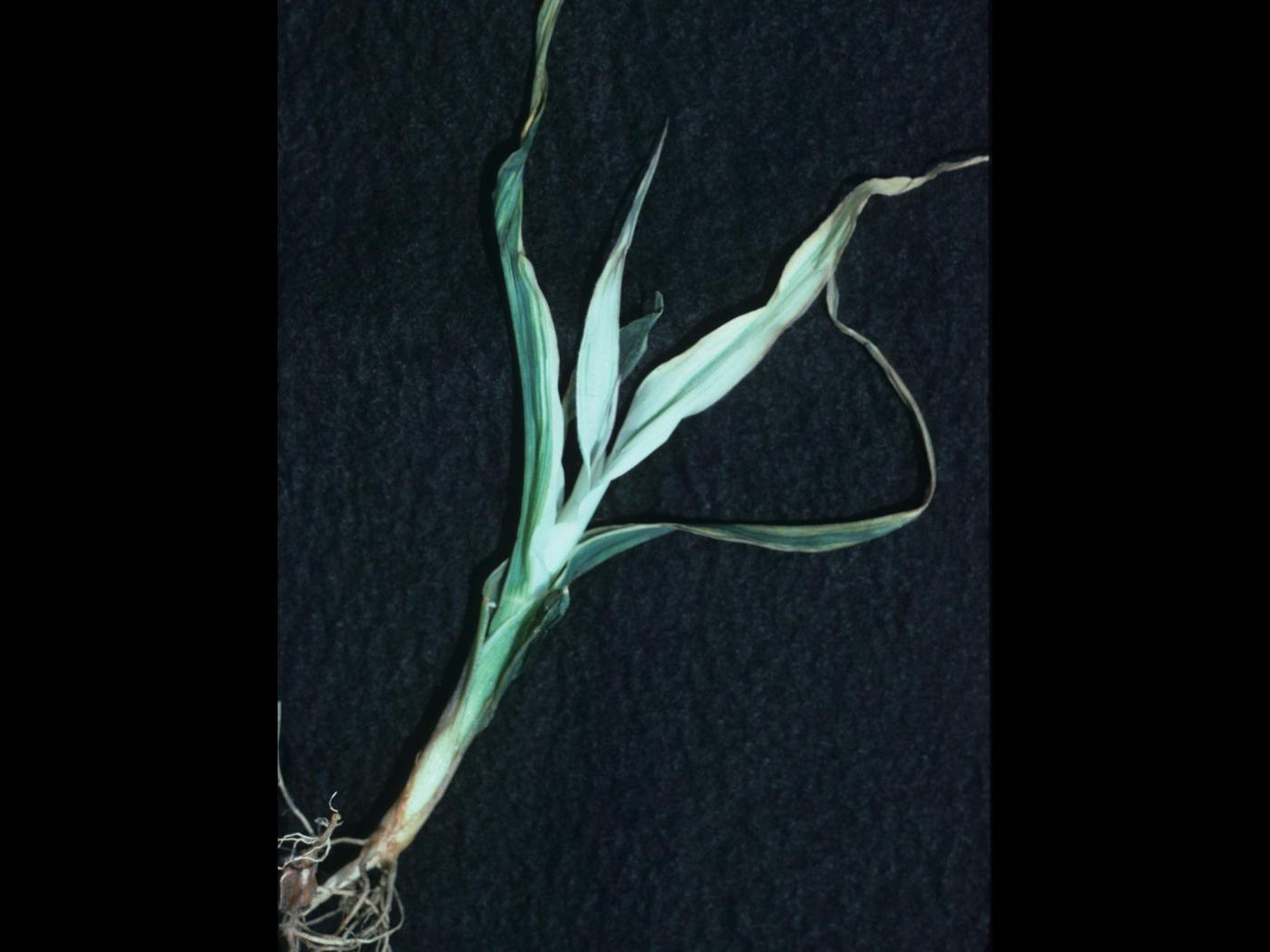 Feuille : au début, présence de petites bandes chlorotiques sur le limbe qui deviennent de larges bandes blanches situées de chaque côté de la nervure centrale. Le jaunissement débute à la base de la feuille et progresse vers l’extrémité, mais n’envahis souvent que le tiers inférieur du limbe. Les nouvelles feuilles sont parfois complètement blanches. La nervure centrale et la marge demeurent vertes. Les feuilles sont petites. Les symptômes sont souvent visibles du stade 6 feuilles jusqu’au stade 10 à 12 feuilles.
