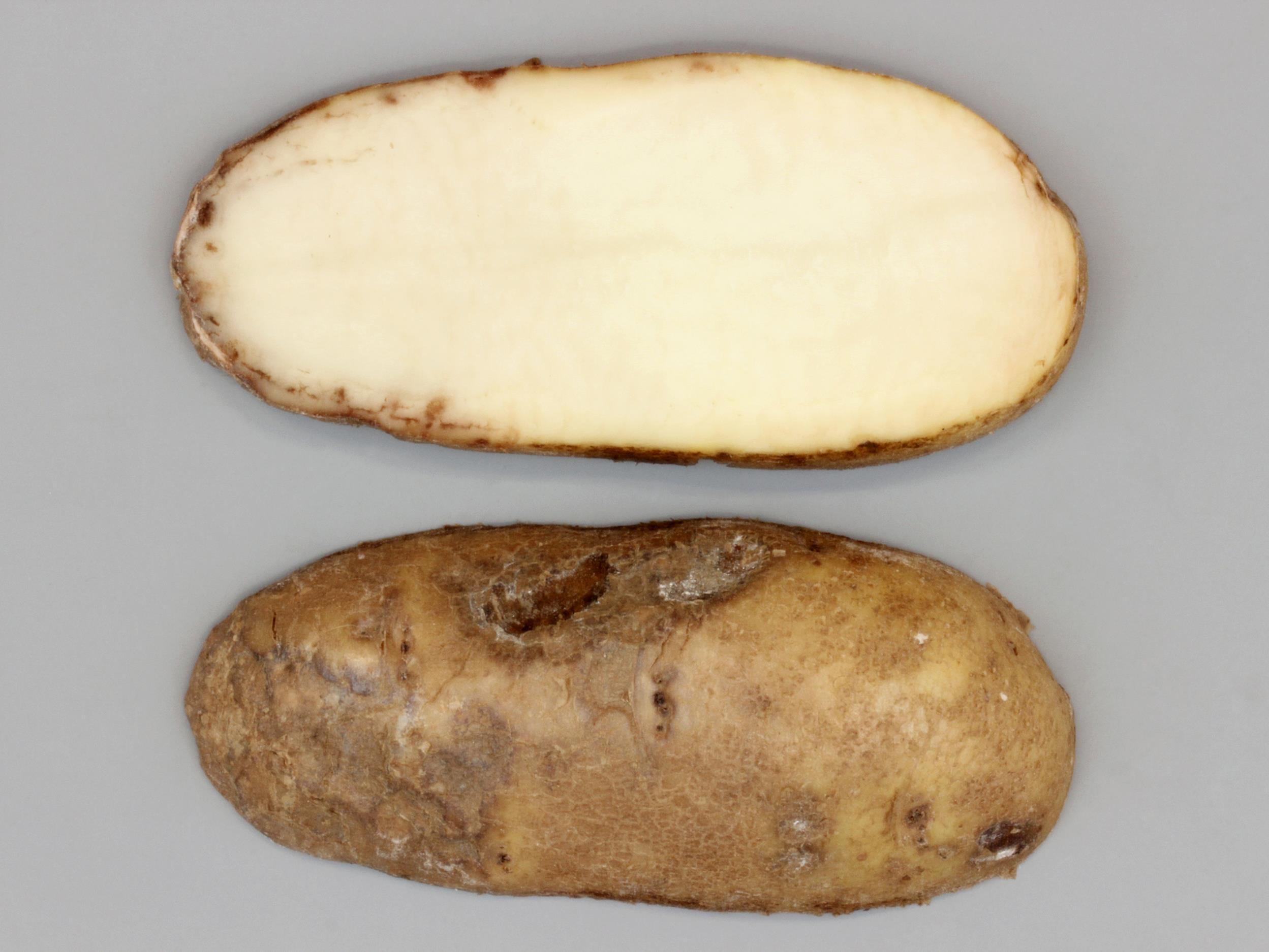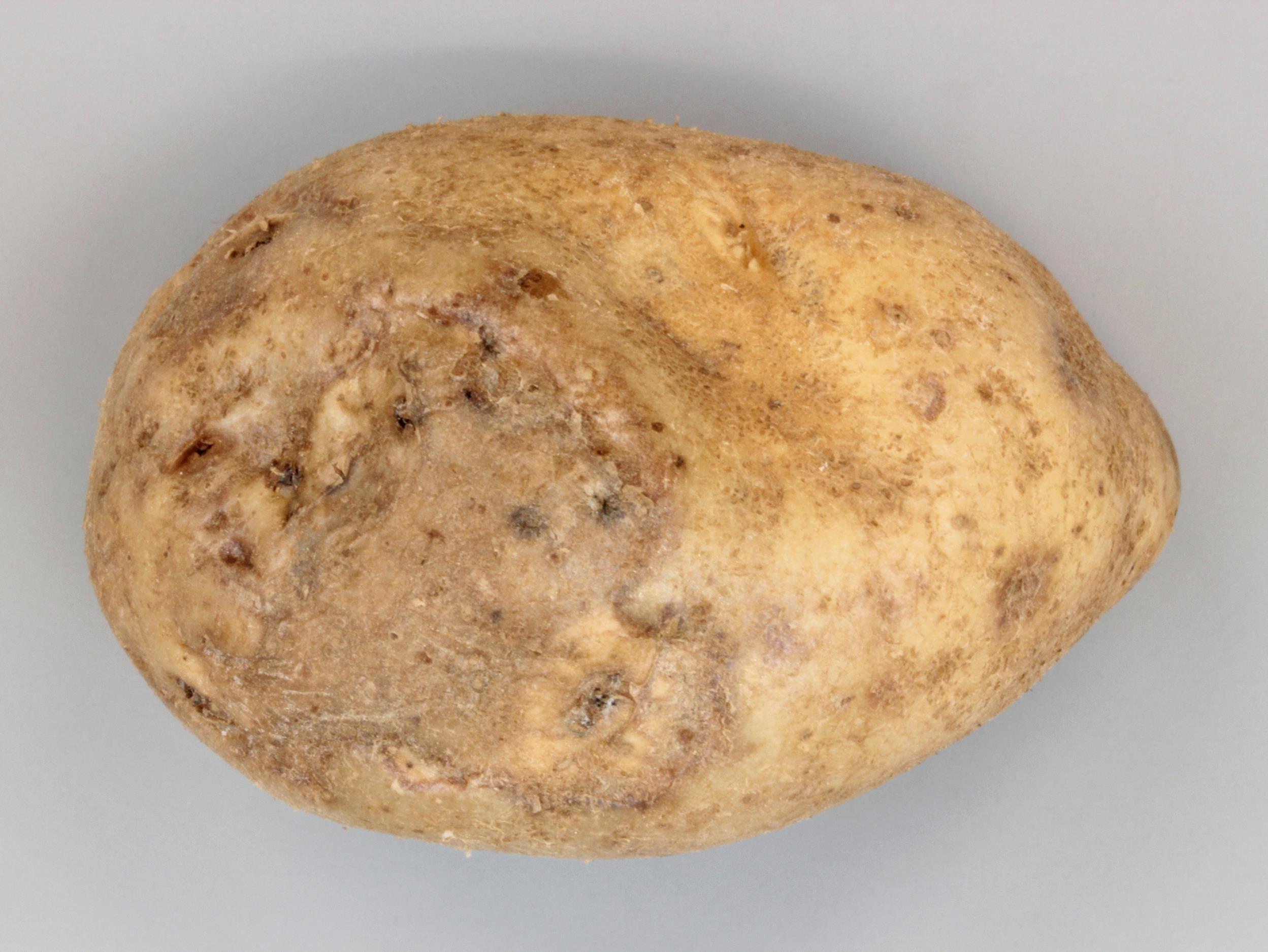 Description: Le périderme des tubercules de pomme de terre (cv 'Goldrush') provenant d’un entrepôt montre de larges zones foncées et déprimées, d’une forme irrégulière, dans la région du talon. Sous ces zones, la chair est brune sur quelques millimètres de profondeur et l’anneau vasculaire est noir dans la zone affectée (non visible ici). Aucun agent pathogène n’a été détecté des tubercules. Ces symptômes sont causés par du gel en entrepôt (température basse de l’air).