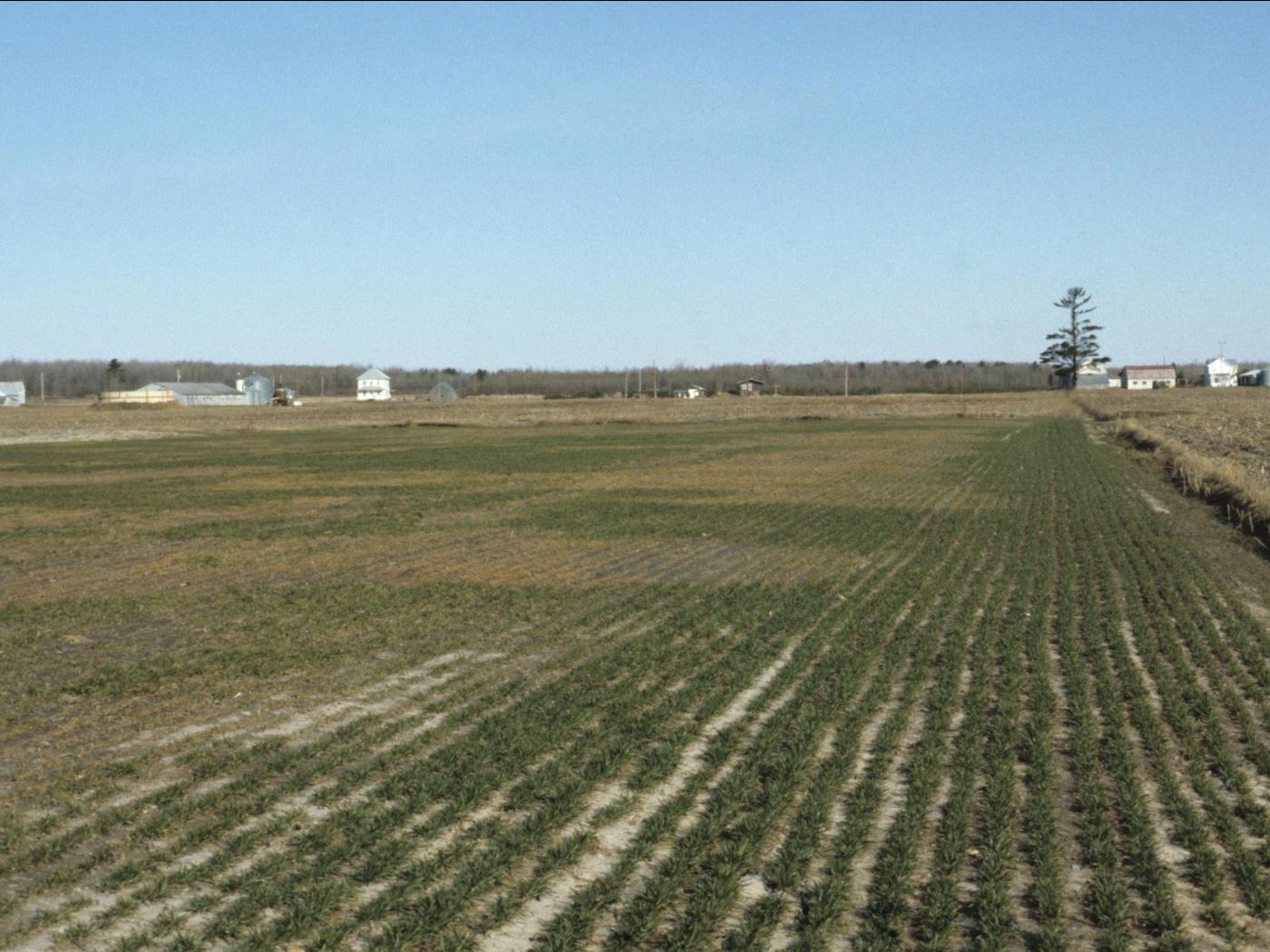 Description: Dans un champ de blé d’automne, les zones dégarnies sont composées de plants qui ont un faible développement ou qui sont desséchés à la suite d’une mauvaise survie à l'hiver. Les zones où les plants sont morts correspondent à de petites baissières où l'eau s'est accumulée et où les plants sont morts par asphyxie par la glace (gel hivernal). Cette culture de blé d'automne a été ensemencée sur un sol non nivelé. La photo a été prise au début mai.