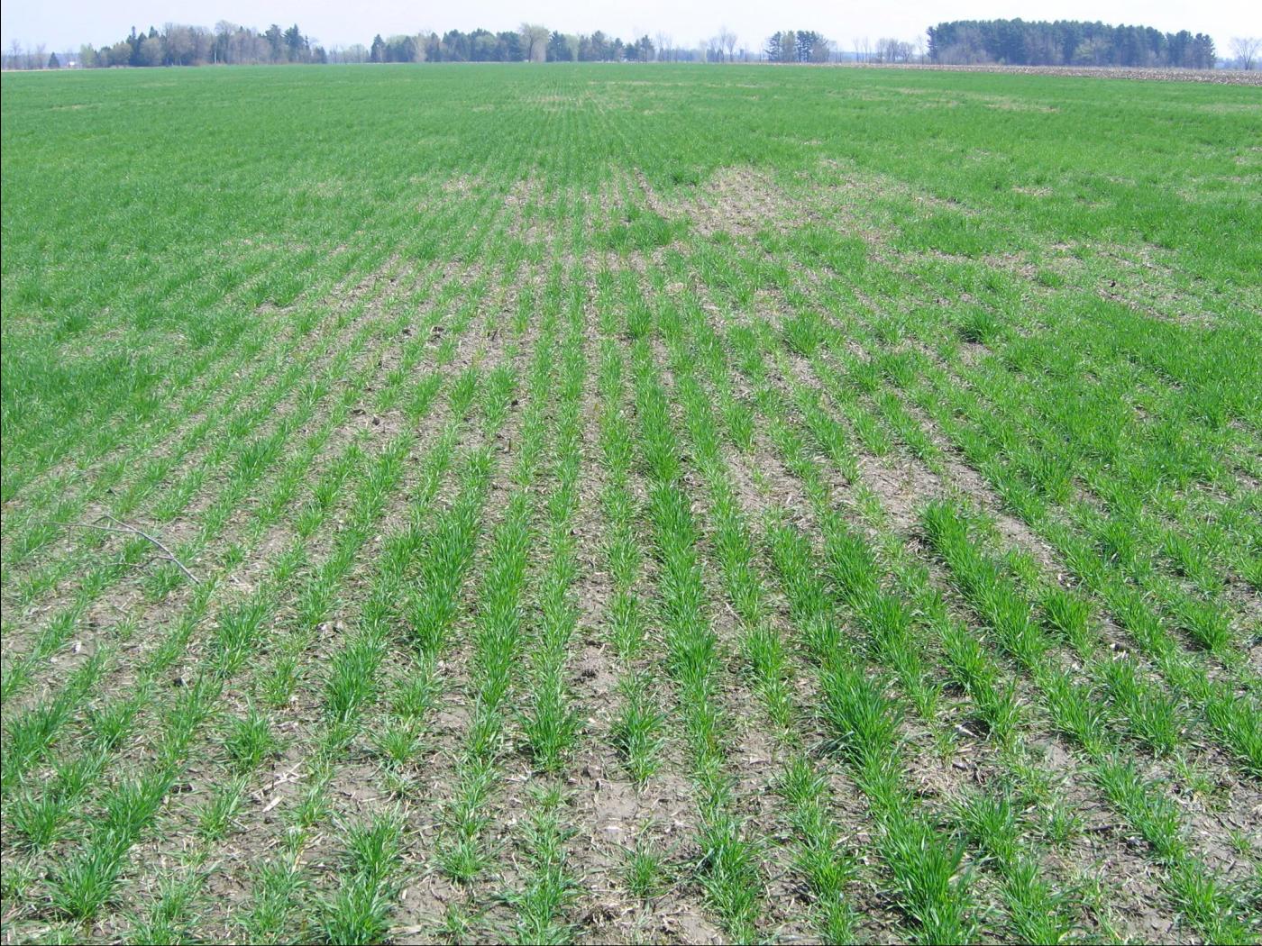 Description: Dans un champ de blé d’automne, les zones brunes sont composées de plants desséchés qui ont eu une mauvaise survie à l'hiver. Les zones où les plants sont morts correspondent à de petites baissières où l'eau s'est accumulée et où les plants sont morts par asphyxie par la glace (gel hivernal).