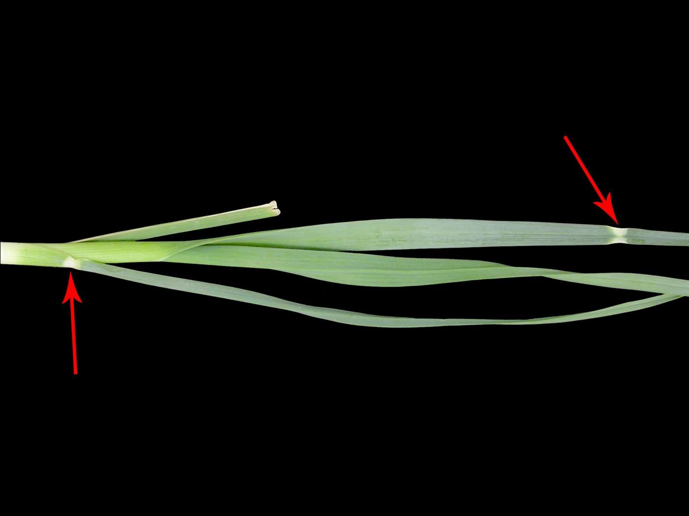Légende: Blanchiment et constriction du limbe sur feuille de poireau