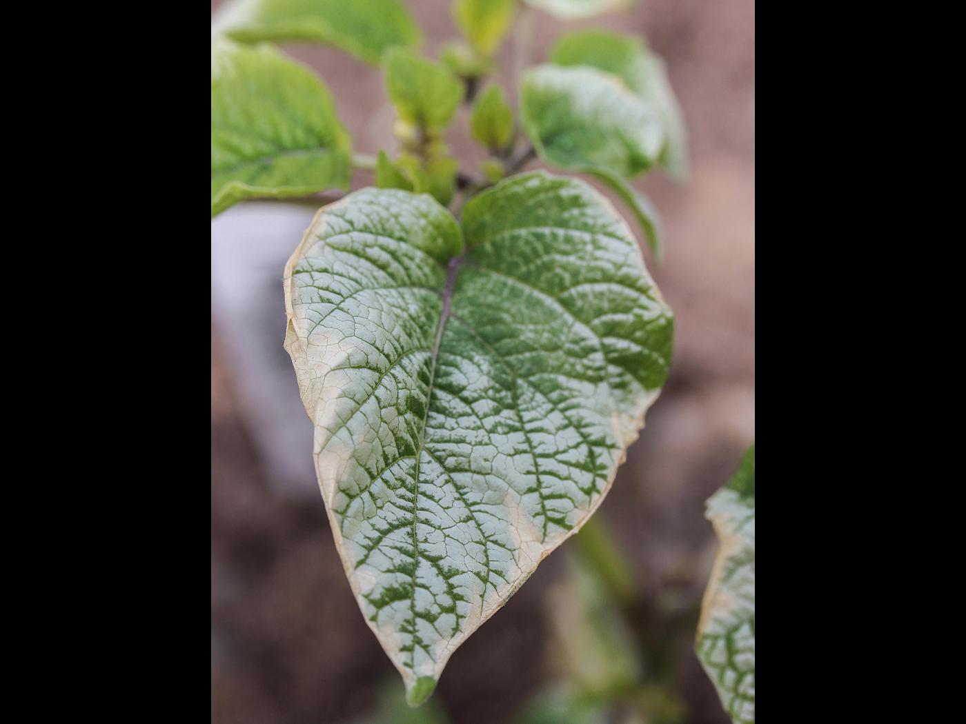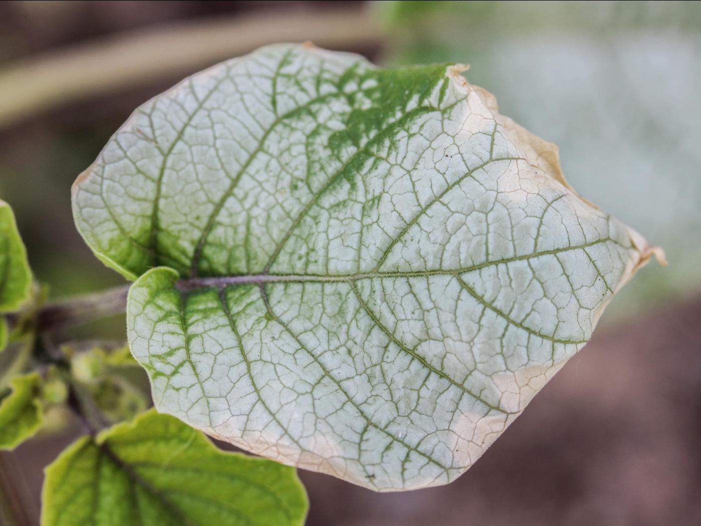 Description: Une feuille de cerise de terre montre un blanchiment du limbe débutant à la marge et progressant entre les nervures. Une brûlure de la marge de la feuille est également visible. Tous les niveaux de feuilles étaient affectés. Les symptômes sont apparus à la suite d’un gel printanier survenu au début du mois de juin.