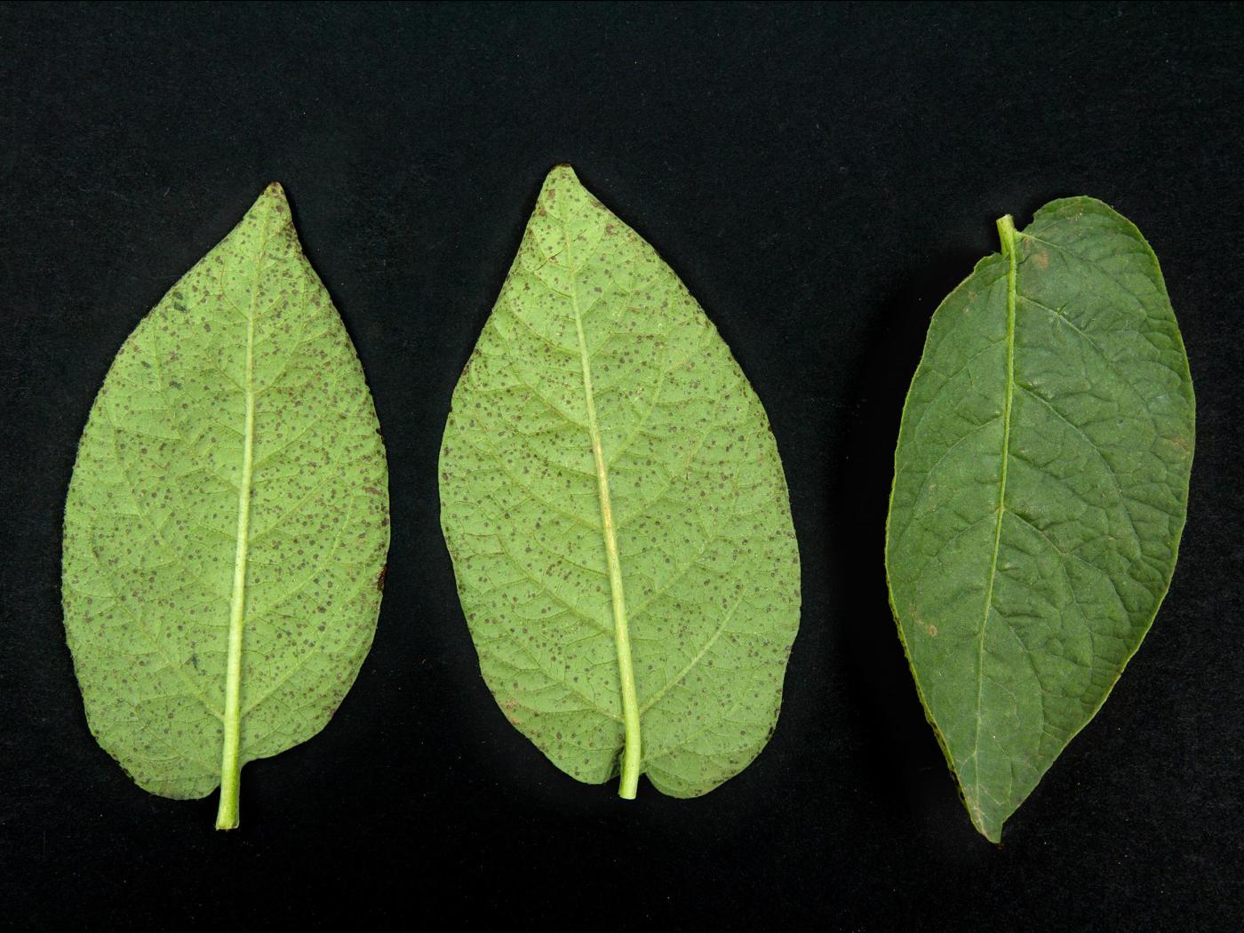 Description: À la face inférieure des folioles de pomme de terre (cv 'Mystère'), présence de nombreuses taches noires surélevées, dont les cellules sont éclatées. Ce dommage est caractéristique de l’œdème.
