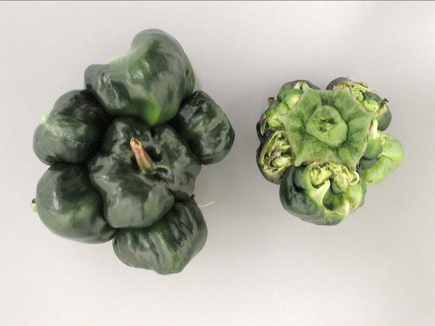 Fruit : est déformé et aplati. Le fruit est souvent plus large que long. Il tend à avoir plus de loges et moins de graines.