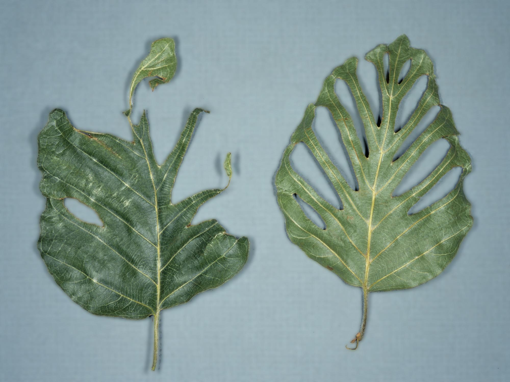 Description: Des feuilles de hêtre provenant d’une pépinière sont déformées. Le limbe ne s’est pas complètement développé entre les nervures ou une partie du limbe et de la marge est absente. Dans le livre de Sinclair et Lyon (2005), ce symptôme réfère à l’effet d’un gel printanier sur les bourgeons à feuilles ou sur des feuilles qui ne sont pas encore pleinement déployées.