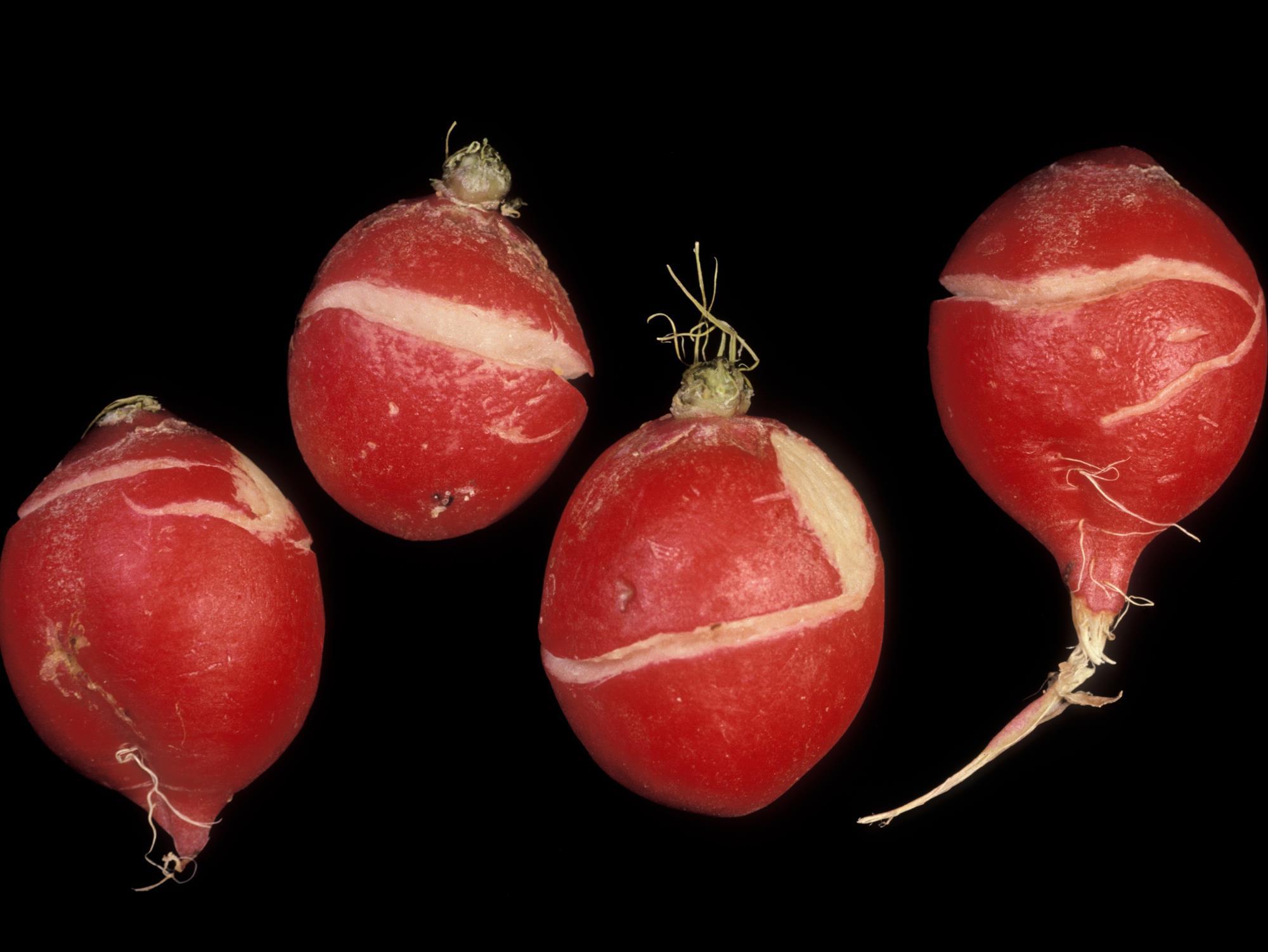 Description: À la récolte, des radis (cv 'Scarlet Knight') présentent de larges fentes horizontales pouvant à l’occasion faire entièrement le tour de la racine. Les fentes sont localisées dans la moitié supérieure du radis. Les examens microscopiques n’ont pas révélé la présence d’agents pathogènes. Les dommages sont attribuables aux chocs des radis l’un sur l’autre lors de la récolte mécanique. Il s’agit de blessures mécaniques.   La conseillère agricole mentionne que plus de 40 % des radis sont affectés. Lorsque les radis sont arrachés à la main, ils sont intacts. Par contre, s’ils sont récoltés mécaniquement, ils ont des fentes. Le problème est observé principalement lorsque les récoltes ont lieu en septembre. Les radis sont probablement trop turgescents ce qui les rend fragiles. Il est également possible que la récolteuse soit mal ajustée et blesse le légume racine. Le même problème s’est produit avec trois variétés de semences provenant de trois grainetiers différents et peu importe les conditions climatiques prévalant lors de la récolte (chaudes, sèches, fraîches). Dans ce cas, la régie de l’eau, la fertilisation et le bon fonctionnement de la récolteuse sont à revoir.