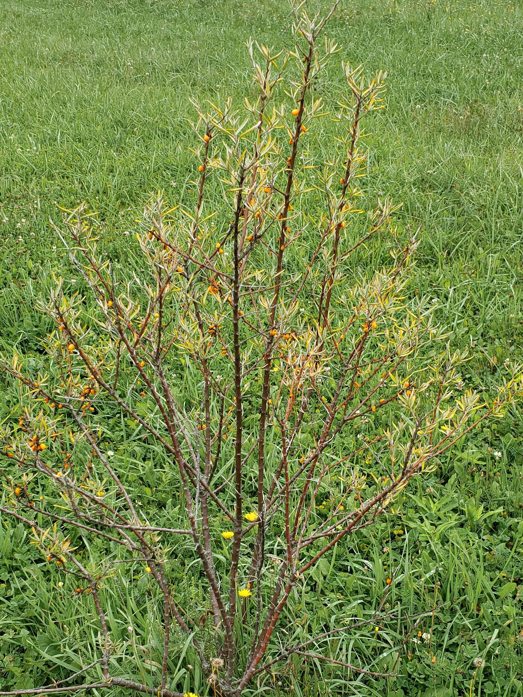 Description: Les feuilles de ce plant d'argousier sont chétives et jaunâtres.