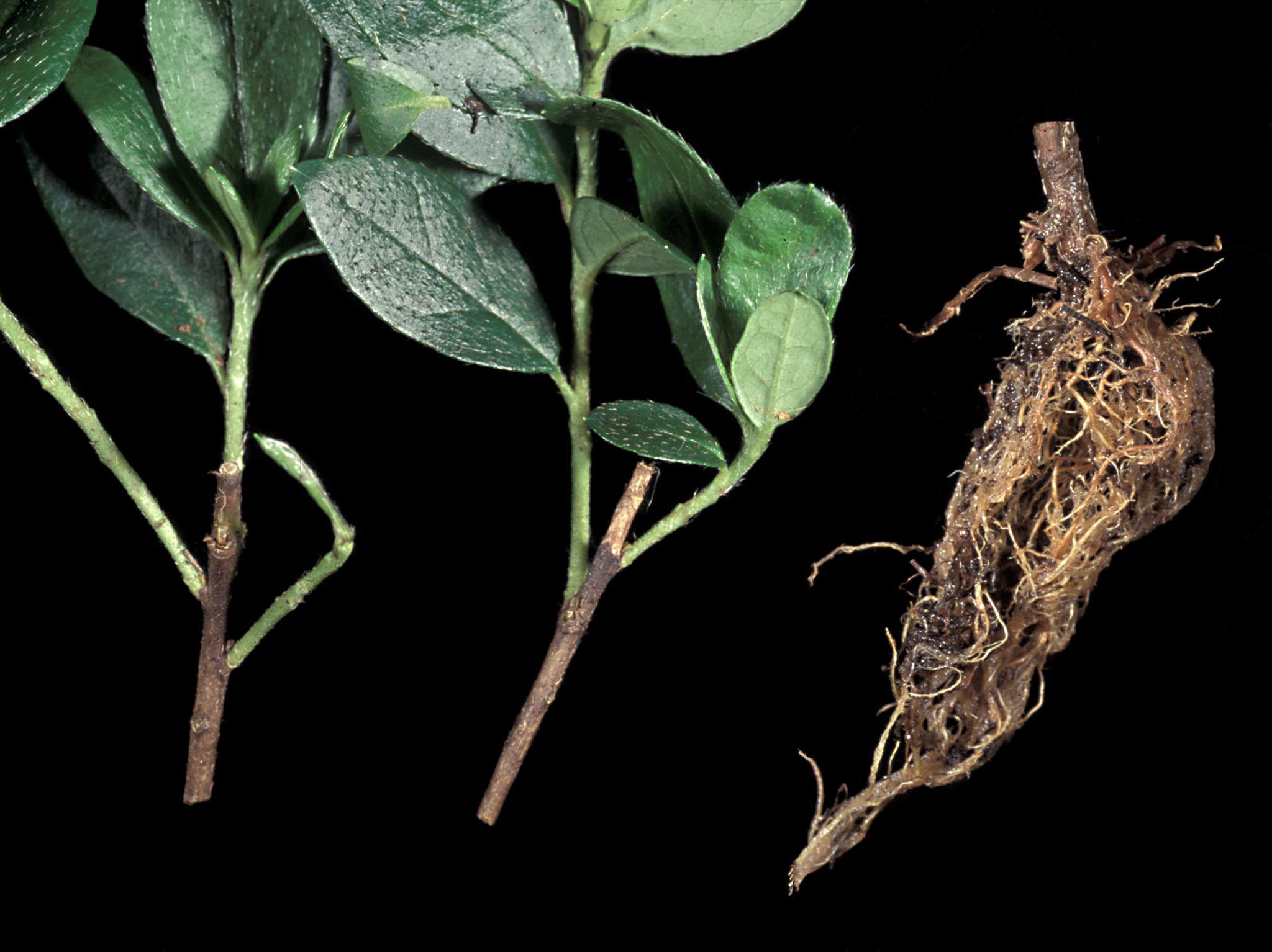Description: Un rhododendron montre un brunissement de la tige, au collet et sur les racines. Le feuillage ne présente aucun symptôme. Les tests de laboratoire ont révélé la présence du champignon Cylindrocladium sp., responsable du dépérissement chez le rhododendron. Il s’agit probablement de Cylindrocladium scoparium.