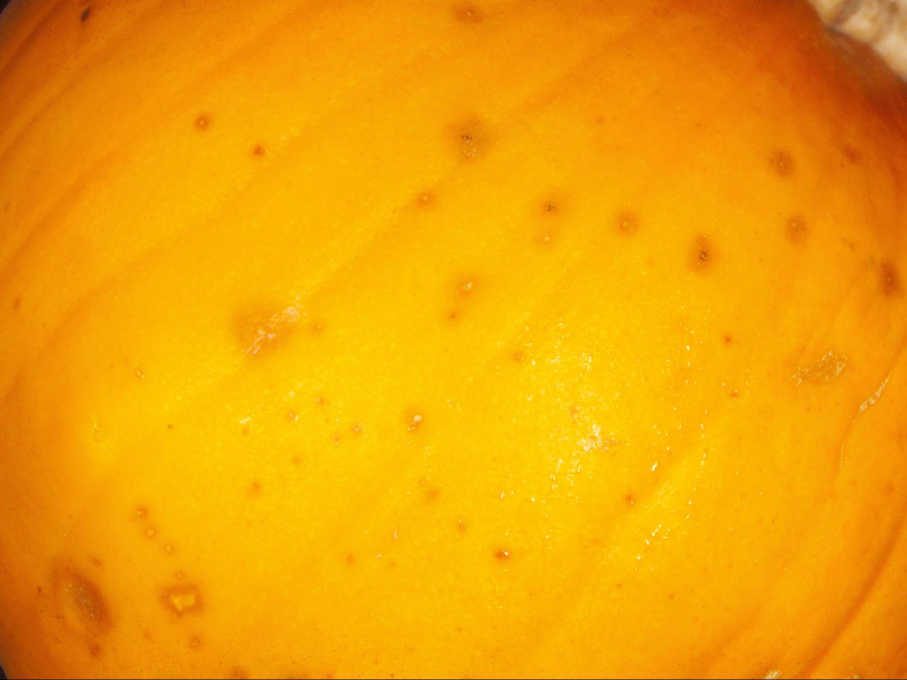 Description: Sur l'épiderme d’une citrouille provenant d'un champ, présence de taches brun clair à orangées, plutôt circulaires, aqueuses et légèrement déprimées. Le centre des taches est blanc avec parfois un point noir au milieu. Les observations microscopiques ont révélé la présence de setae et de conidies du champignon Colletotrichum sp., responsable de l’anthracnose chez les cucurbitacées. Il s'agit probablement de Colletotrichum orbiculare.