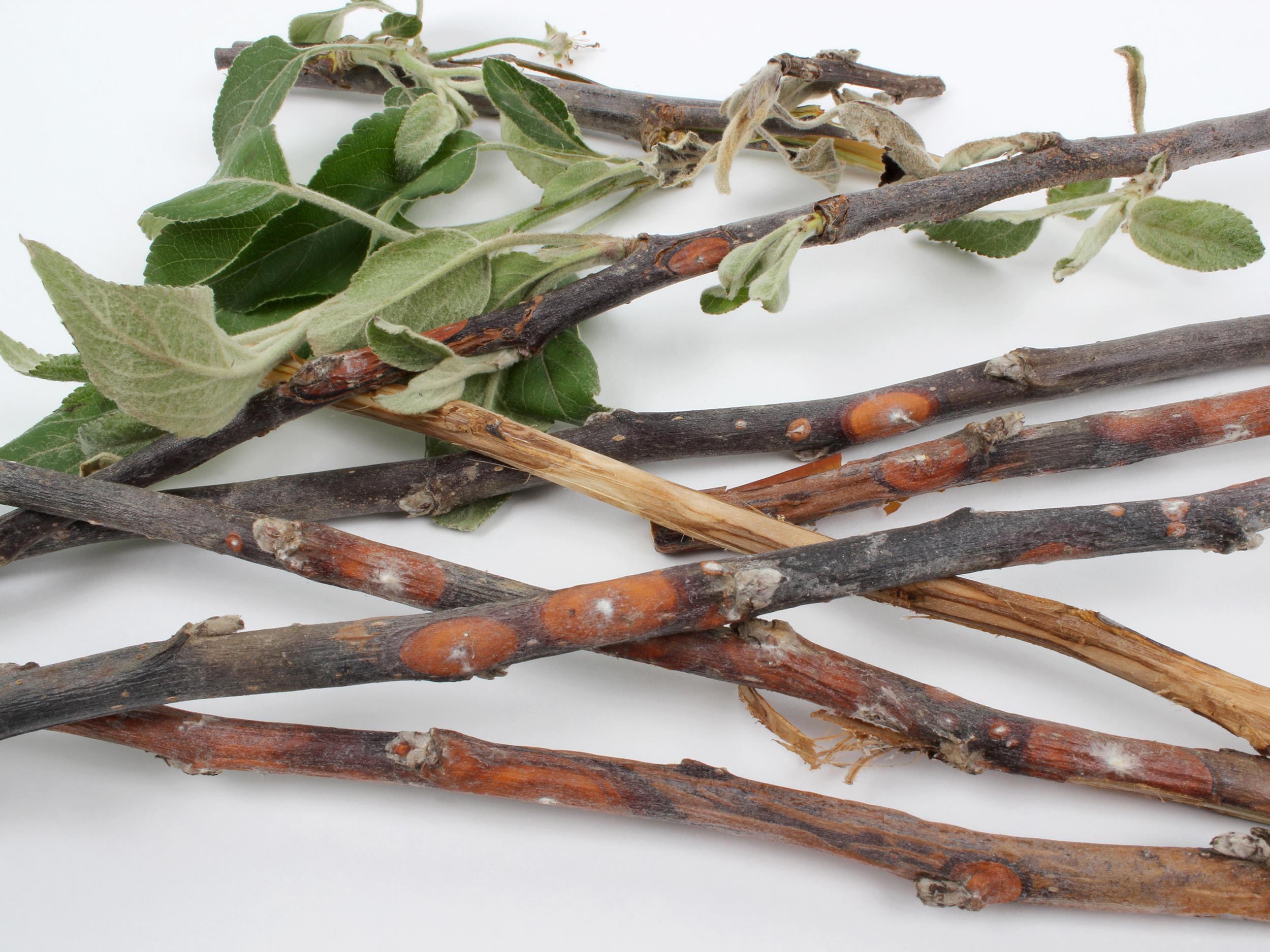 Description: De jeunes pommiers ont un faible débourrement. Les nouvelles pousses portent de nombreux chancres bruns en forme de cible et entourés d’une marge foncée. Un mycélium blanc est présent au centre des chancres. Le bois est brun vis-à-vis des chancres. Les tests de laboratoire ont révélé la présence du champignon Cytospora sp., responsable du chancre cytosporéen chez le pommier. La brûlure bactérienne n’a pas été détectée dans les dommages.