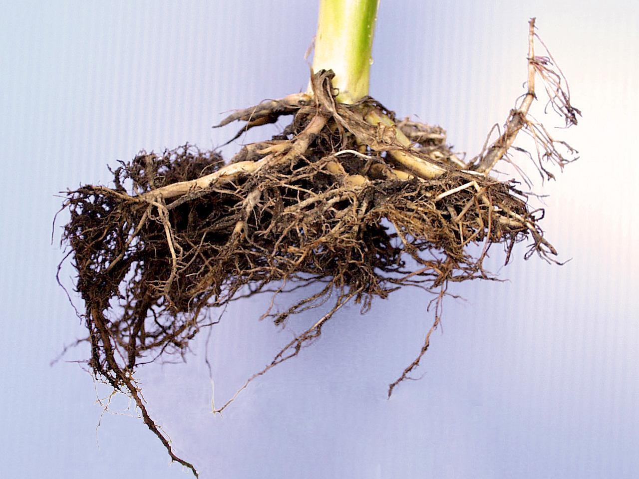 Description: Sur cette image, les racines de maïs sont courtes et noircies à leur extrémité. Les dommages sont apparus à la suite d’une surdose de PROWL (pendiméthaline) ou par la lente dégradation de ce produit dans le sol. Le PROWL est un herbicide de prélevée ou postlevée précoce (à partir d’une feuille étalée de maïs), qui doit être appliqué au sol, mais qui ne doit pas être incorporé. Il est homologué, entre autres, pour le maïs grain et d’ensilage.