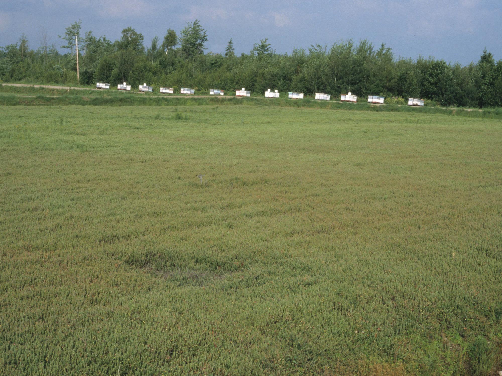 Description: Une grande zone de la cannebergière montre des plants avec des feuilles roussies. Cette anomalie de coloration est imputable à un traitement phytosanitaire combinant le fongicide chlorothalonil et l’insecticide diazion. C’est le chlorothalonil qui est responsable du dommage.