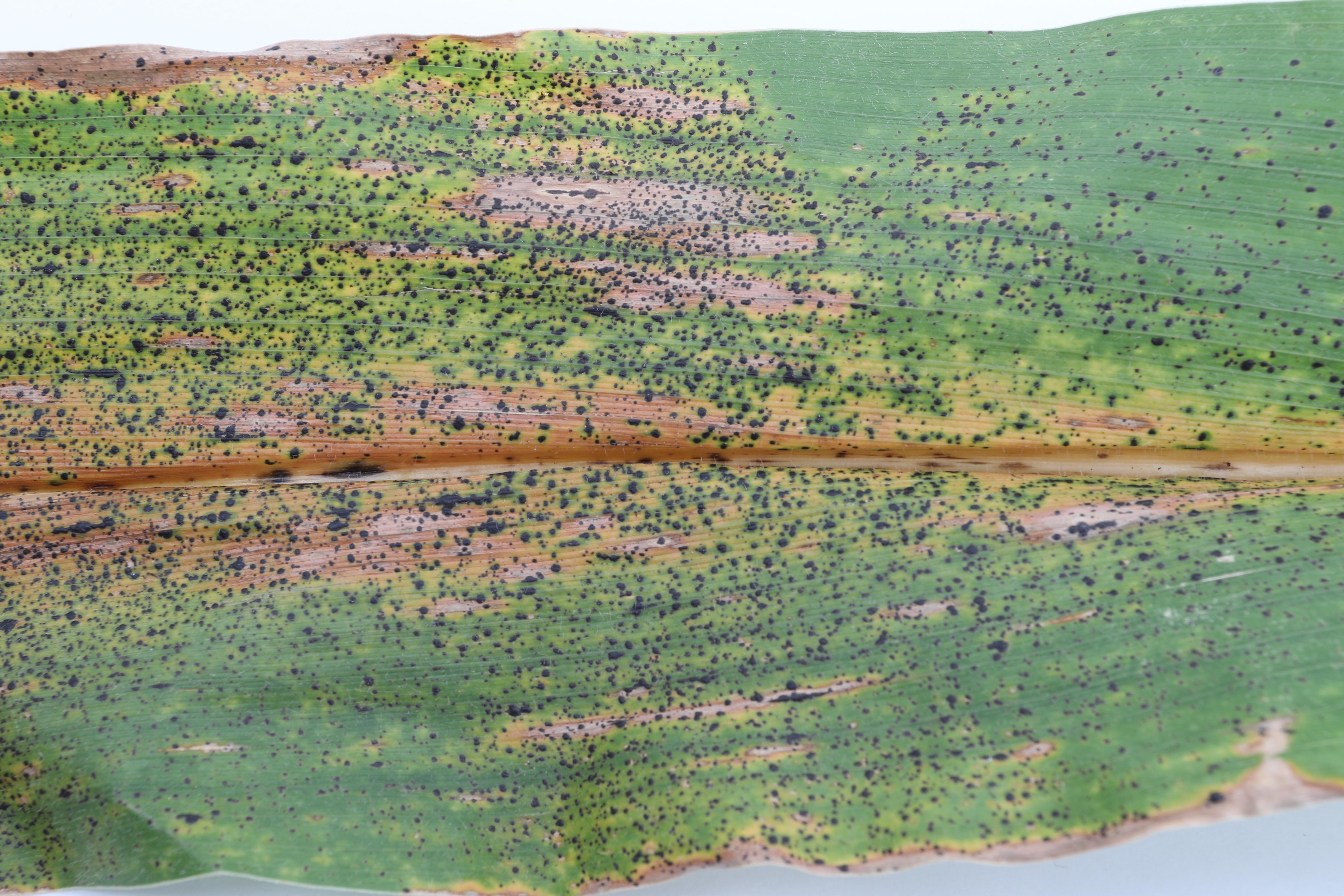 : Symptôme de la tache goudronneuse sur une feuille de maïs.