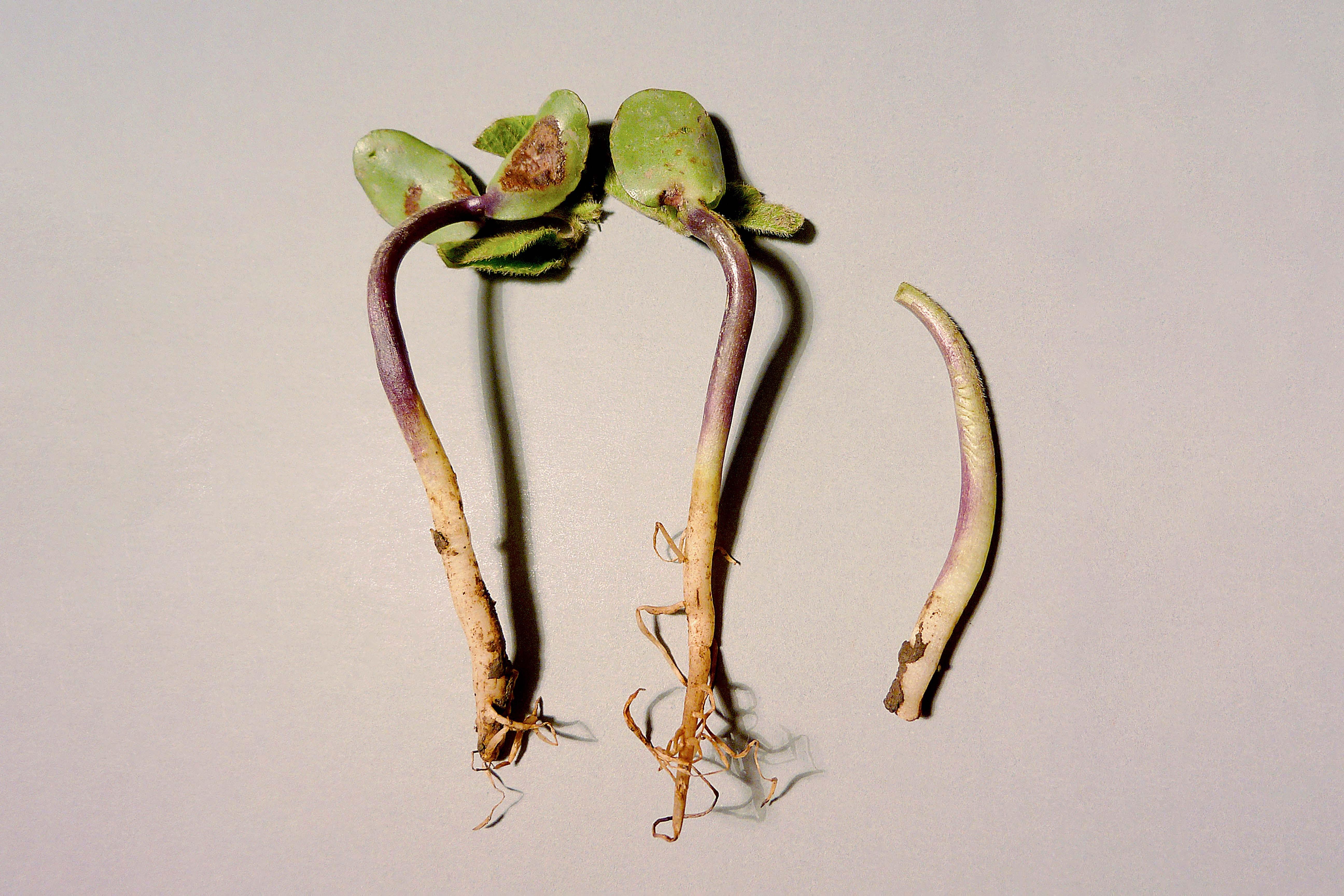Description: Sur des cotylédons de soya, présence de taches brun foncé, d’une dimension variable, et d’une pourriture brune. Les tests de laboratoire ont révélé la présence de Phytophthora sojae, responsable de la fonte des semis chez le soya.