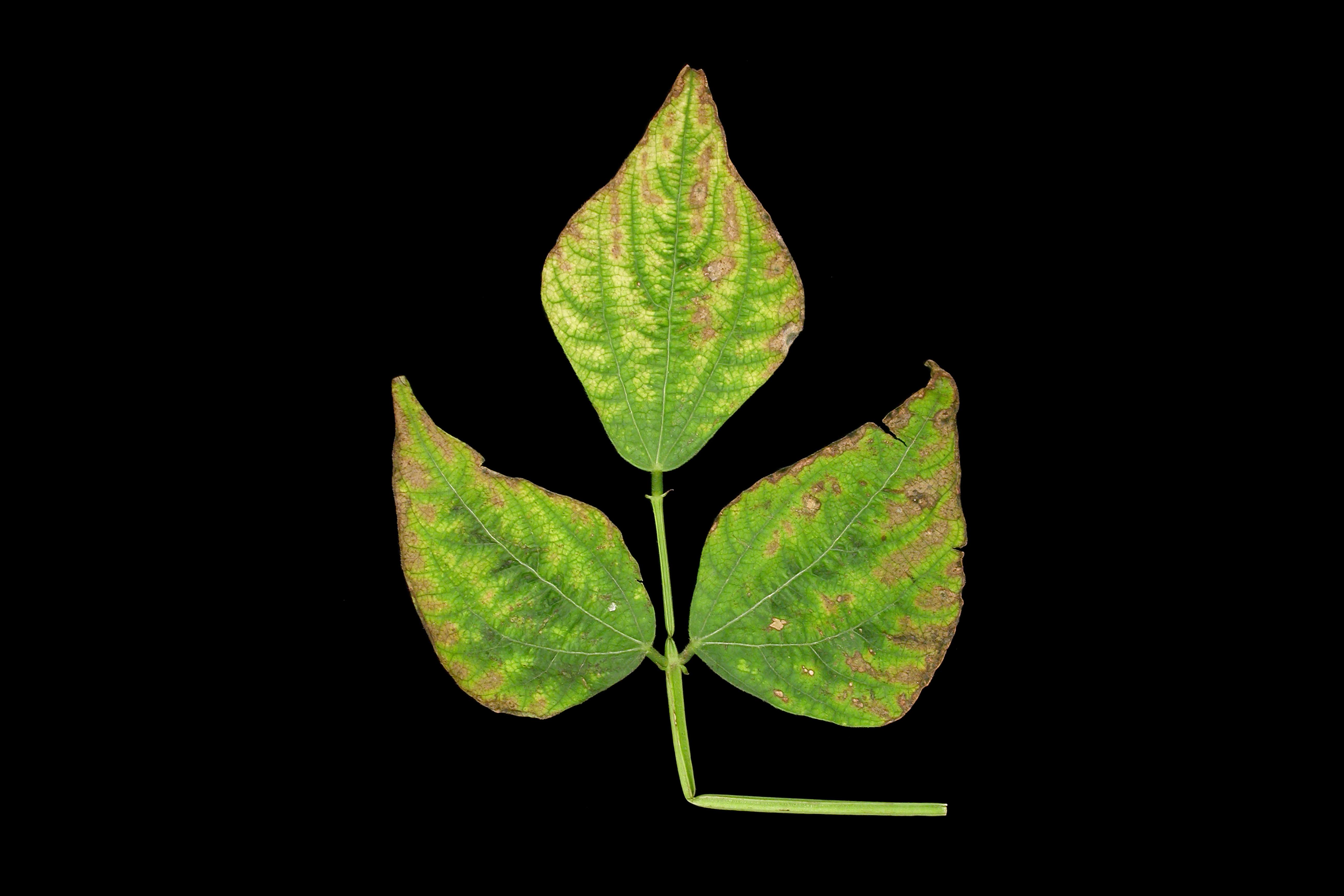 Description: Une feuille trifoliées de haricot (cv 'Hawaï') montre des brûlures entre les nervures et à la marge des folioles. Un jaunissement progresse également entre les nervures. Aucune bactérie n’a été détectée des dommages. Ces symptômes s’apparentent à une carence en potassium chez le haricot.