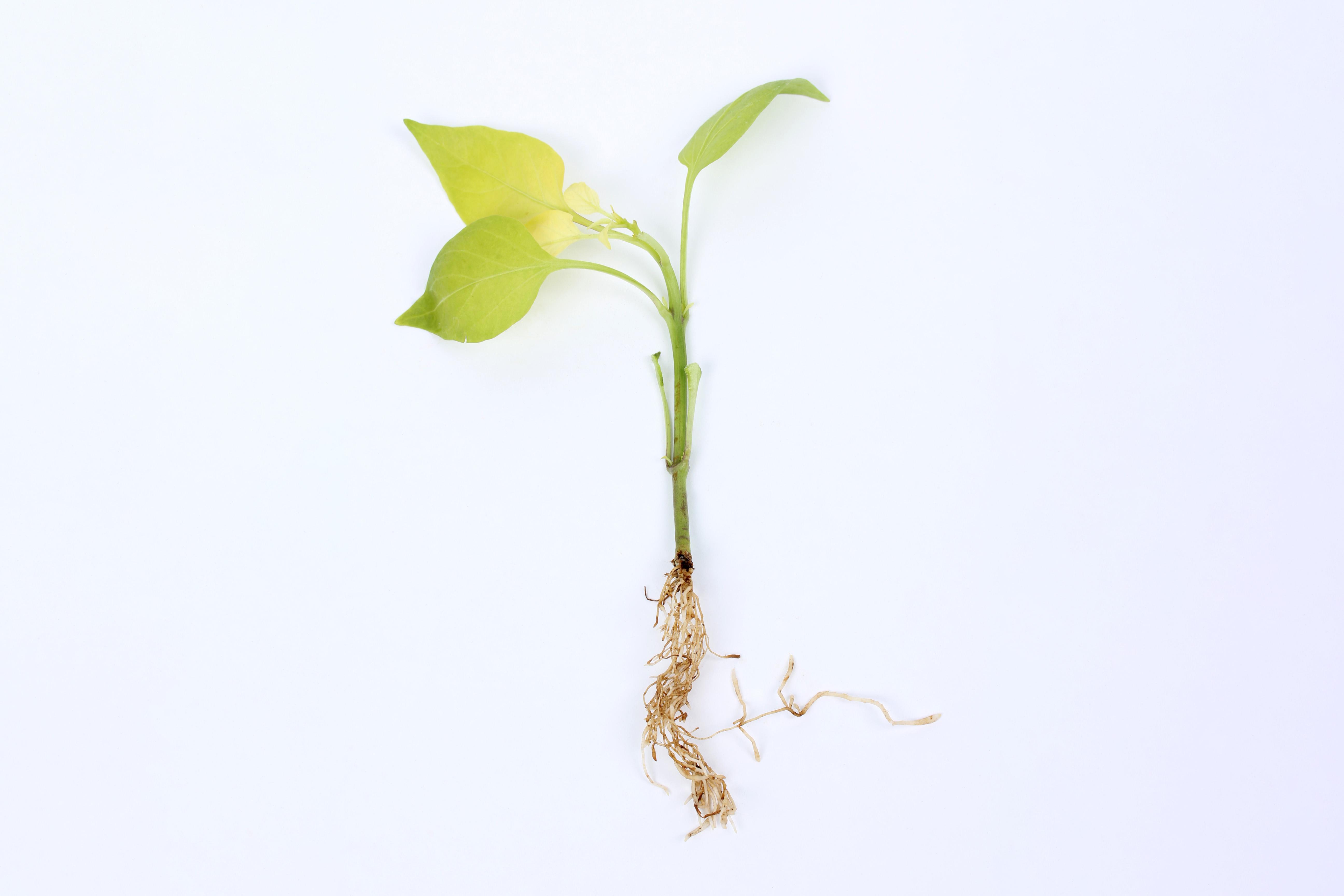 Description: Sur un jeune plant de poivron (stade 5 feuilles), les feuilles terminales et médianes présentent un jaunissement prononcé. Le jaunissement débute à la base du limbe et affecte même les nervures. Les jeunes feuilles sont les plus affectées. L’extrémité de certaines racines est brune. Aucun virus ni champignon racinaire n’a été détecté. Le pH (6,6) et la conductivité électrique (8,1 mS/cm) du substrat sont trop élevés. Comme 95 % de la production est atteinte, il s'agit probablement d'un problème non parasitaire. Les symptômes foliaires s’apparentent à ceux d’une carence en fer.