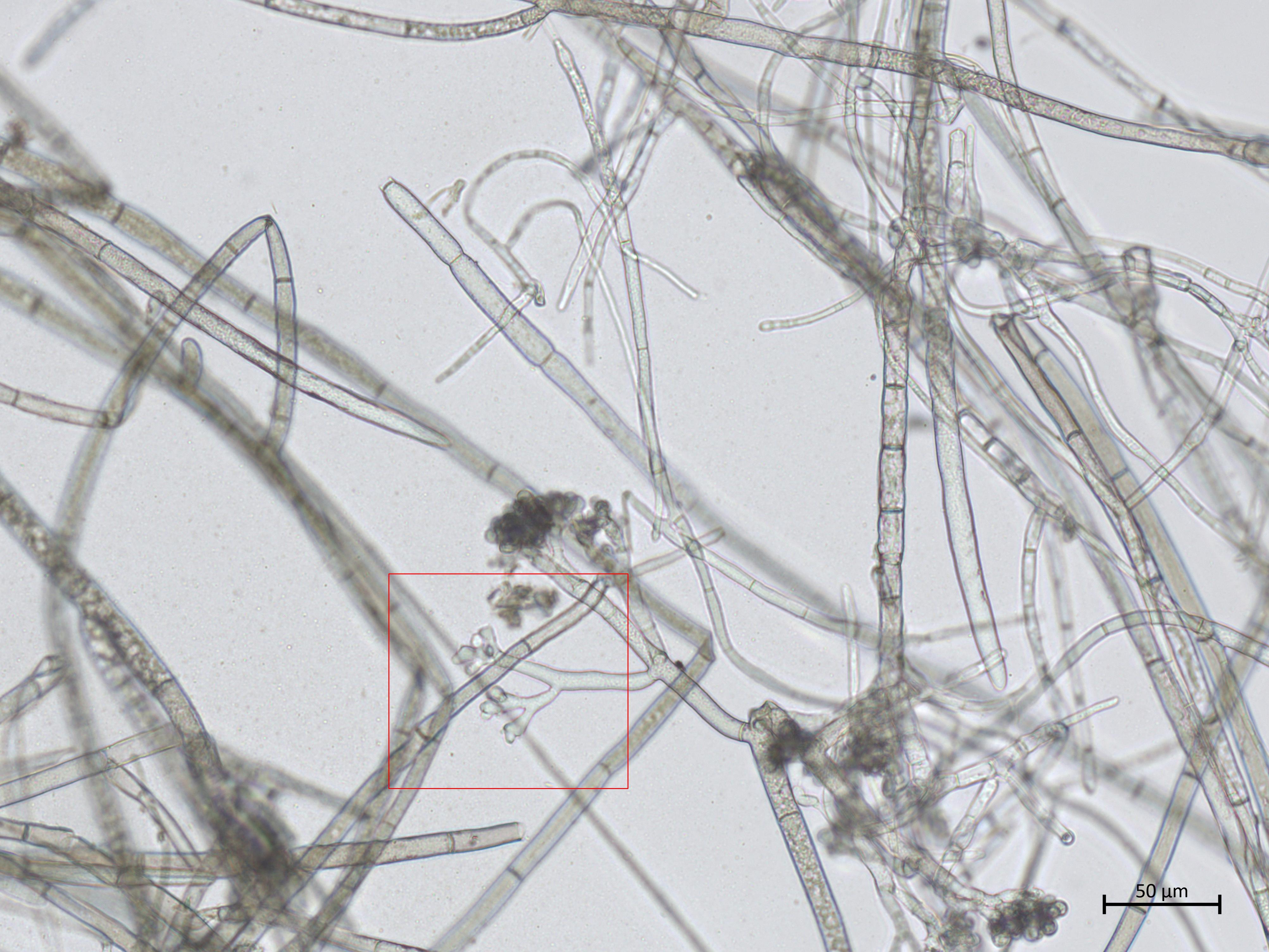 : Conidiophore dénudé de ses conidies parmi des hyphes; voir l'encadré.
