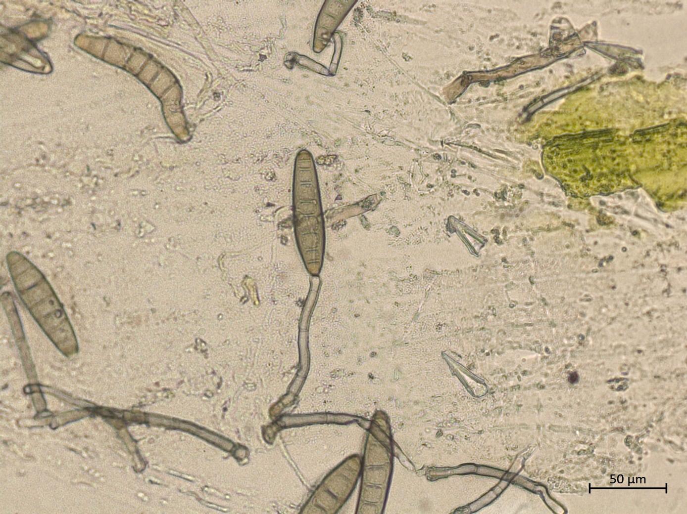 : Conidies de Bipolaris sorokiniana dont une attachée à son conidiophore.