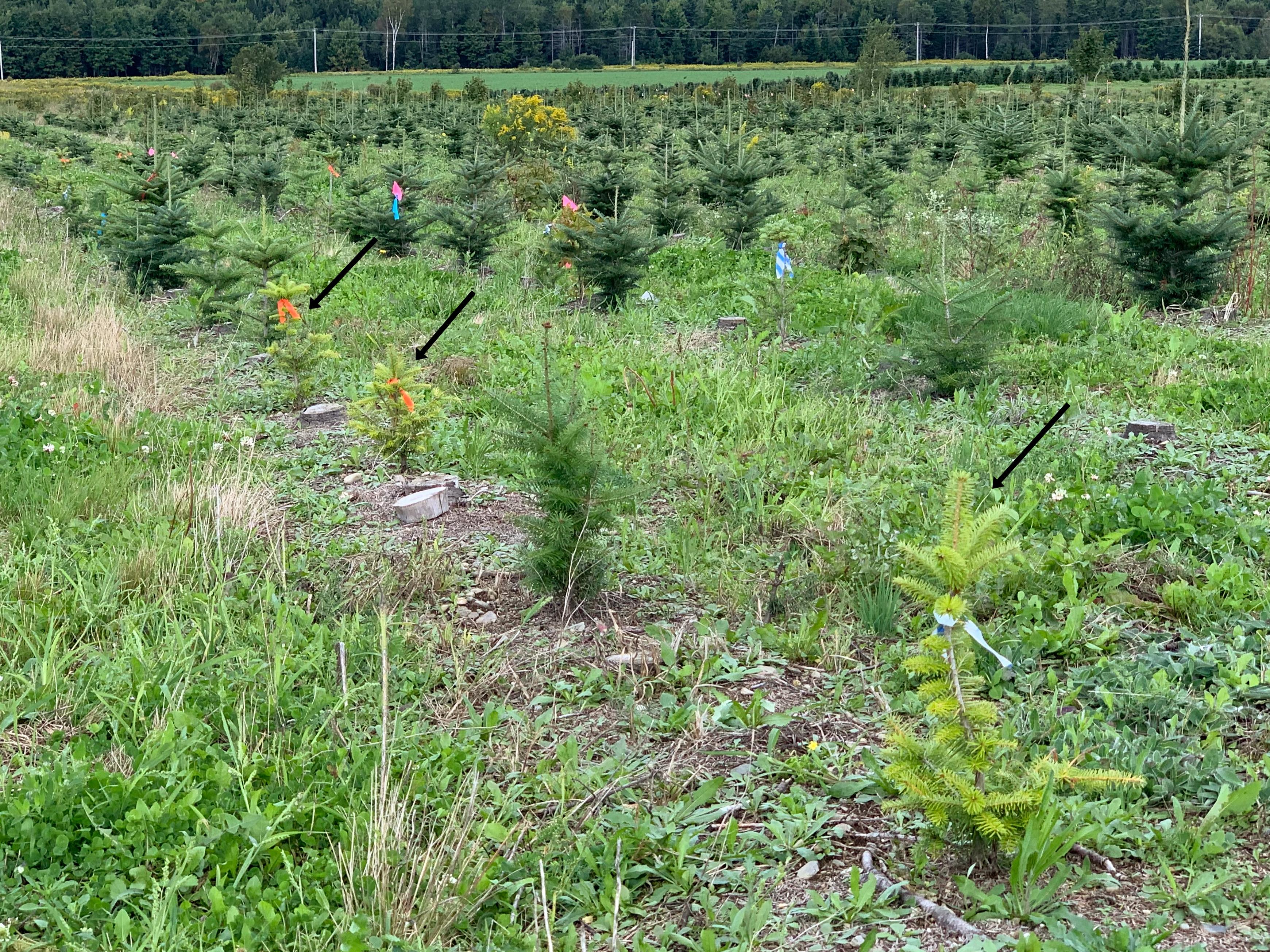 Description: Certains des arbres présents dans cette plantation sont infestés par des colonies de pucerons des racines du sapin baumier (Prociphilus americanus). Les infestés sont de plus petite taille que les autres et leurs aiguilles sont jaunies. Les arbres affectés par les pucerons sont pointés par une flèche noire.