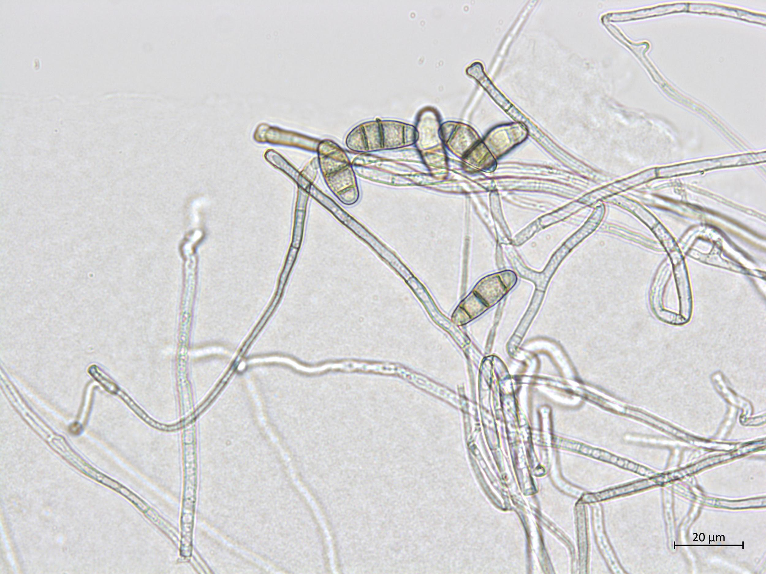 Légende: Hyphes et conidies de Curvularia lunata.