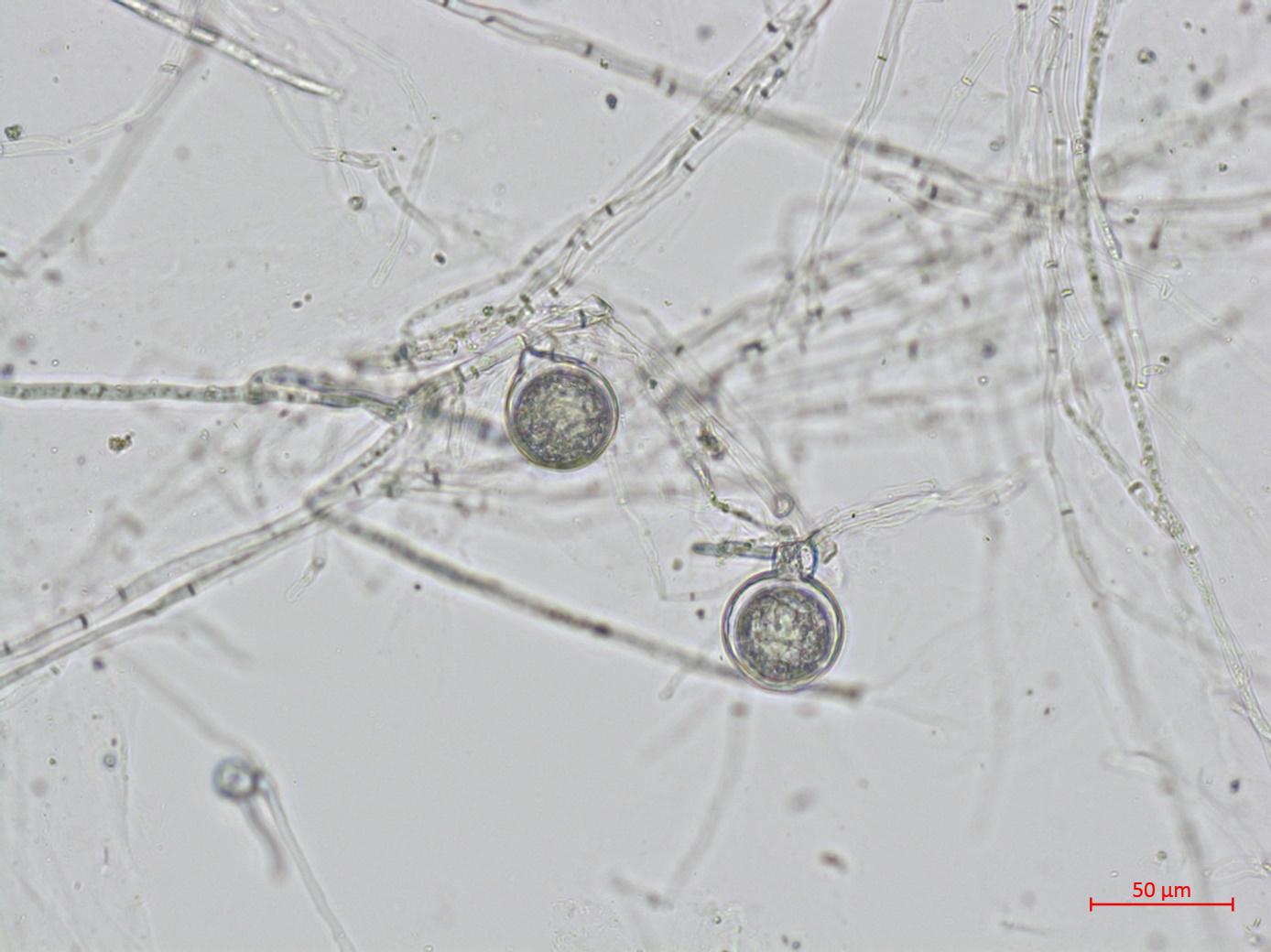 : Oospores de Phytophthora sojae.