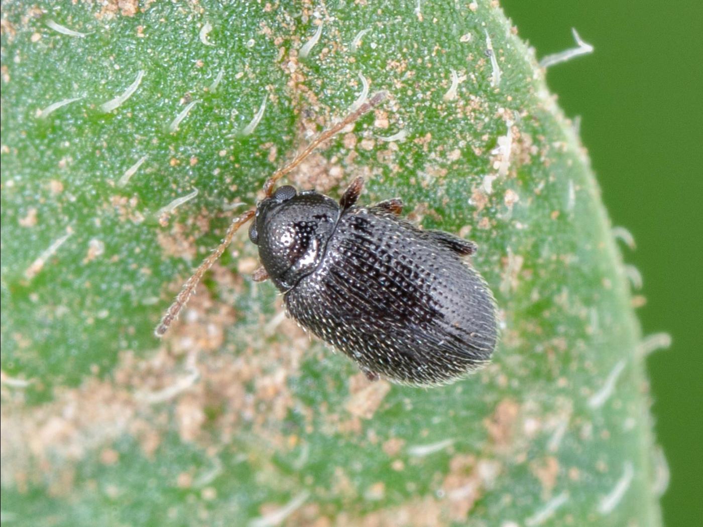Adulte : 1,5 à 2,0 mm; le corps est noir et les élytres sont recouverts d’une fine pilosité blanchâtre; les antennes et les pattes sont brun pâle.