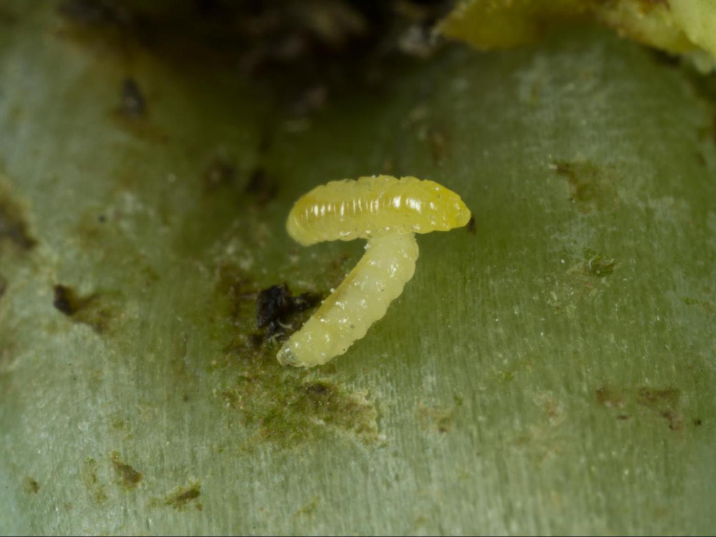 Larve : 2,0 mm à maturité; elle ne possède aucune patte, mais peut effectuer de petits sauts; le corps est de couleur jaune citron; la section antérieure du corps se termine en pointe; la tête est non apparente.