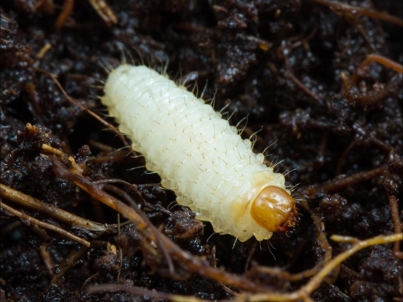 Larve : 10,0 mm à maturité; la tête est brune; le corps est blanc crème, en forme de croissant et porte des soies blanches dont la base est brune; ne possède pas de pattes.