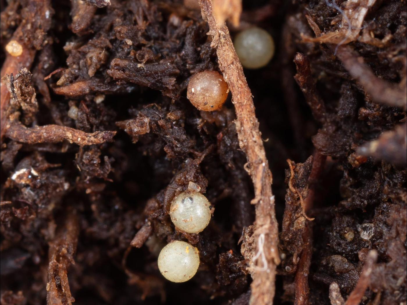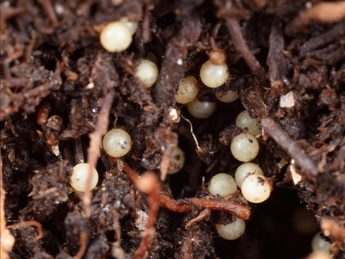Oeuf : 0,7 mm de diamètre; il est de forme sphérique; il est nacré à la ponte, il devient brunâtre et de texture visqueuse par la suite.