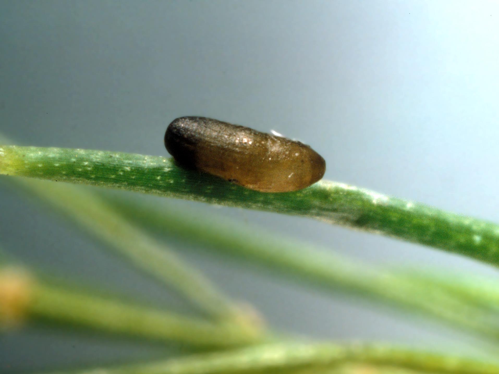 Oeuf : 2,0 mm de long par 0,5 mm de large; de forme elliptique et de couleur gris verdâtre; la base de l’œuf est fixée perpendiculairement à la tige ou la feuille sur laquelle il a été pondu.