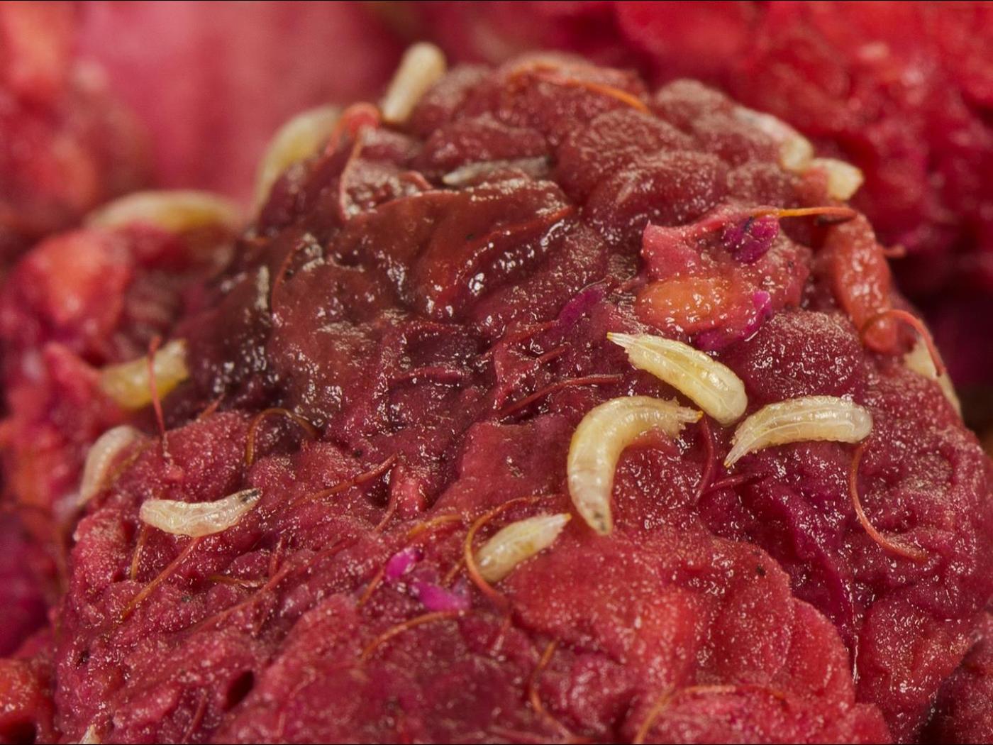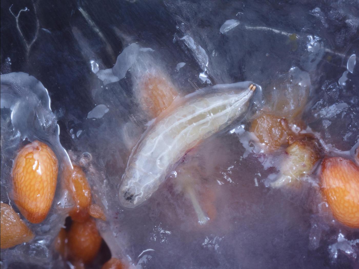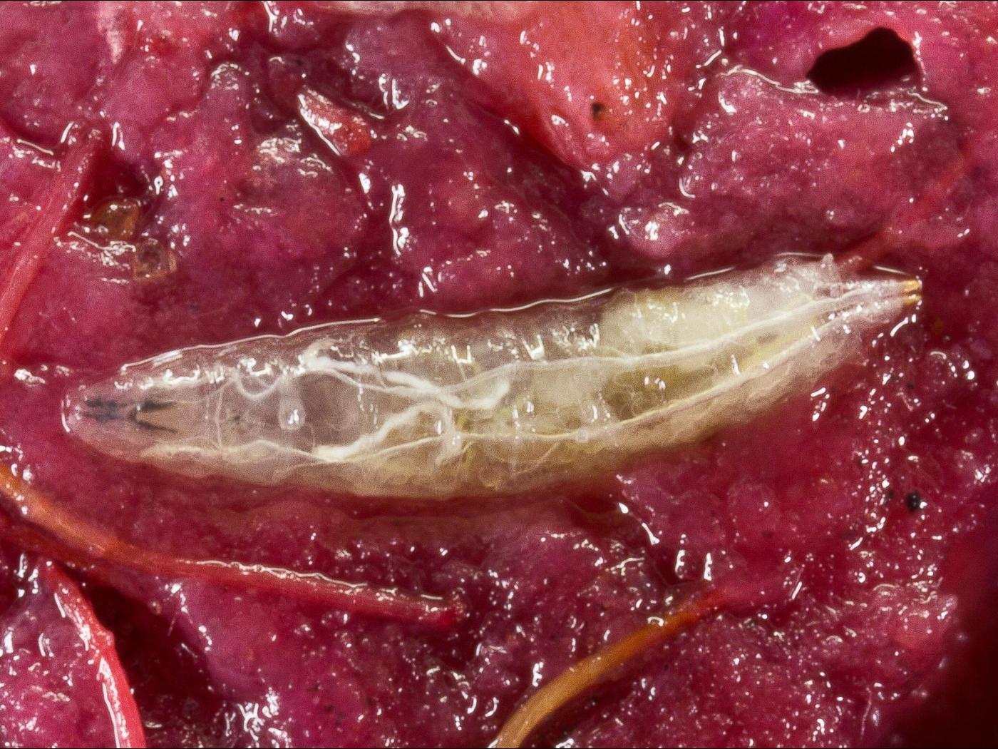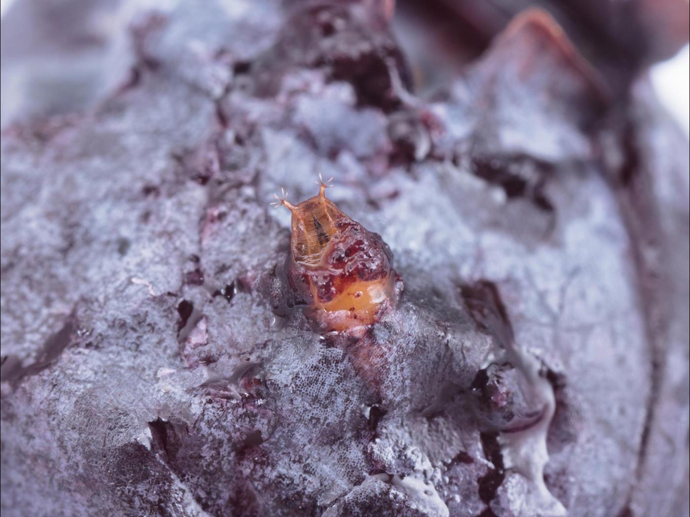 Légende: L'ovipositeur de la drosophile à ailes tachetées est en forme de demi-lune, fortement sclérotisé et dentelé. C'est grâce à cette strucutre particulière que cette espèce est en mesure de
