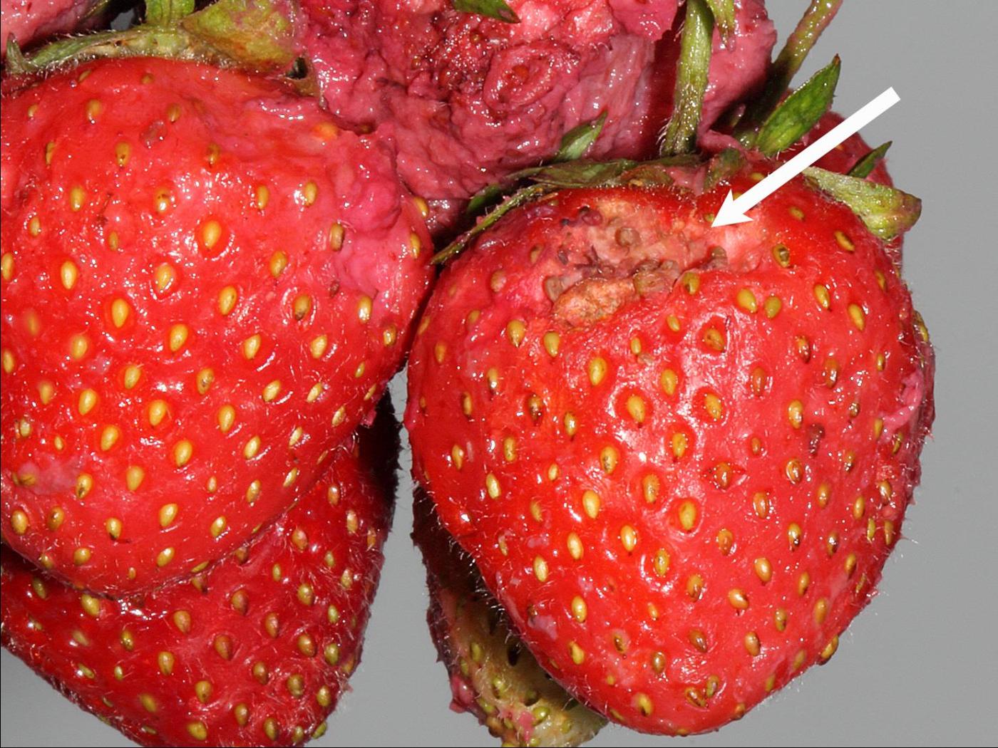 Description: Les adultes et les larves de Harpalus rufipes consomment les graines d'un grand nombre d'espèces de plantes. Ce sont principalement les adultes qui peuvent causer des dommages aux fruits de fraisier en s'attaquant à leurs graines. En prélevant les akènes de la surface du fruit, ils vont abimer la chair et ainsi grandement diminuer la qualité du fruit. Les trous causés par ces insectes vont fréquemment servir de porte d'entrée à divers pathogènes, pouvant ainsi entrainer un pourrissement prématur…