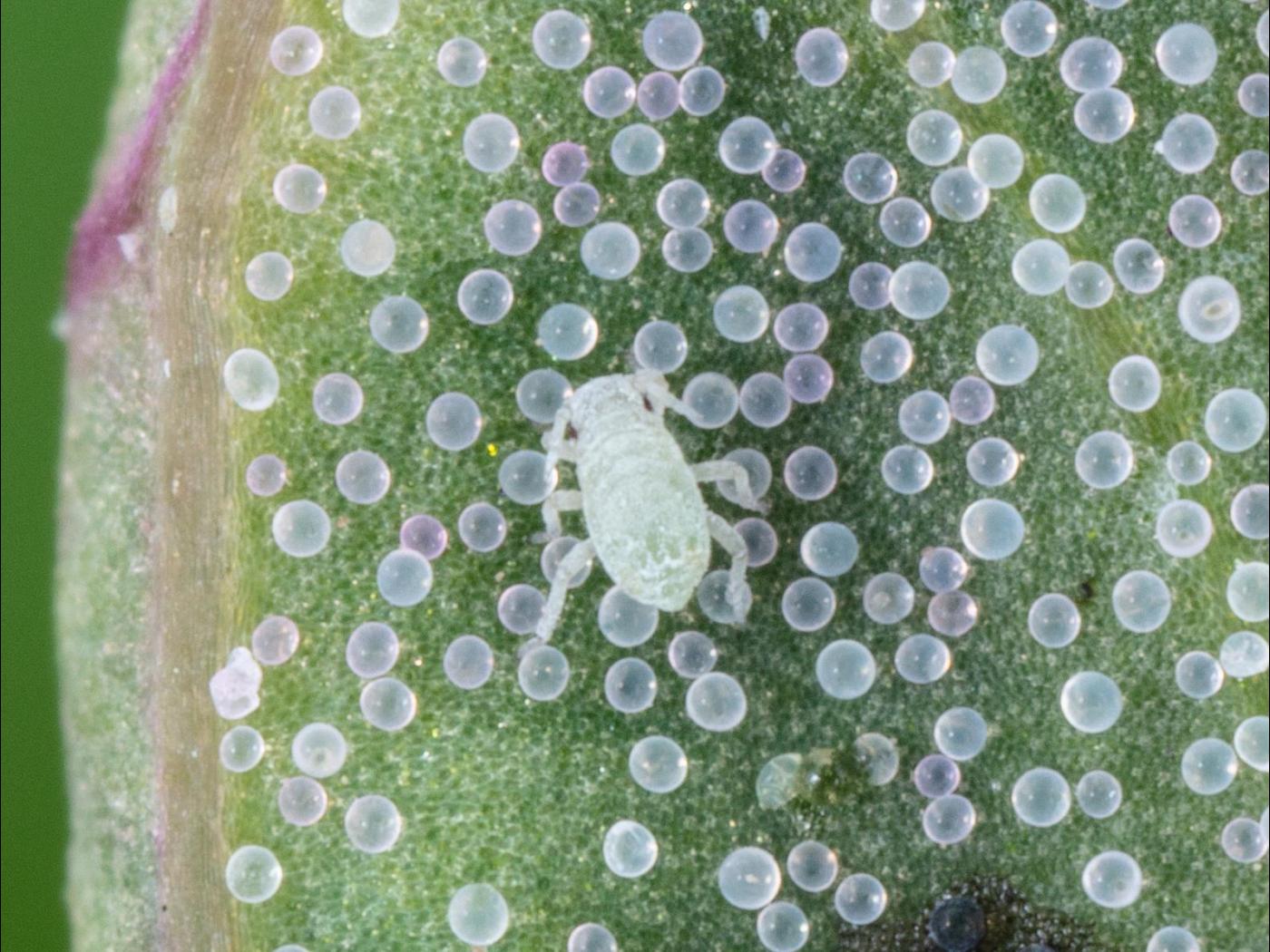Nymphe : 1,0 mm; couleur similaire à celle de l’adulte ailé; avec ou sans tache sur le corps, excepté des marques vertes plus profondes sur le mesothorax.
