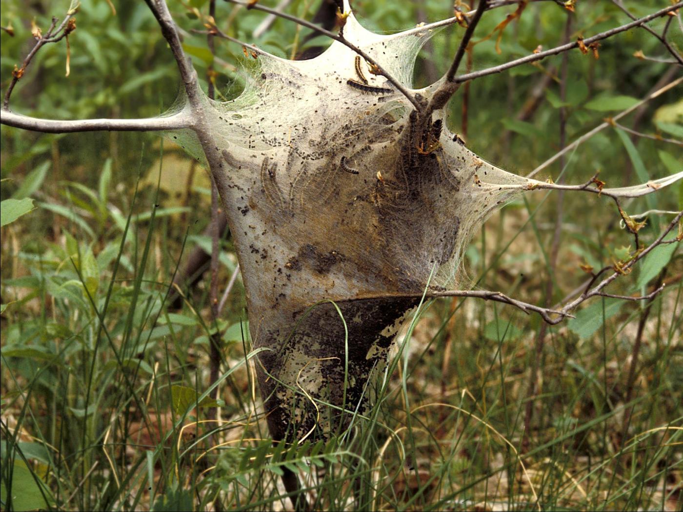Tente de soie tissée par des larves de la livrée d'Amérique : les chenilles de Malacosoma americanum construisent de grandes tentes de soie, principalement pour se mettre à l'abri des prédateurs et des parasites. Ces tentes sont généralement tissées sur les fourches des arbres. La taille des tentes augmente au fur et à mesure que les larves grandissent puisque celles-ci ont besoin d'espace supplémentaire au fil de leur développement.