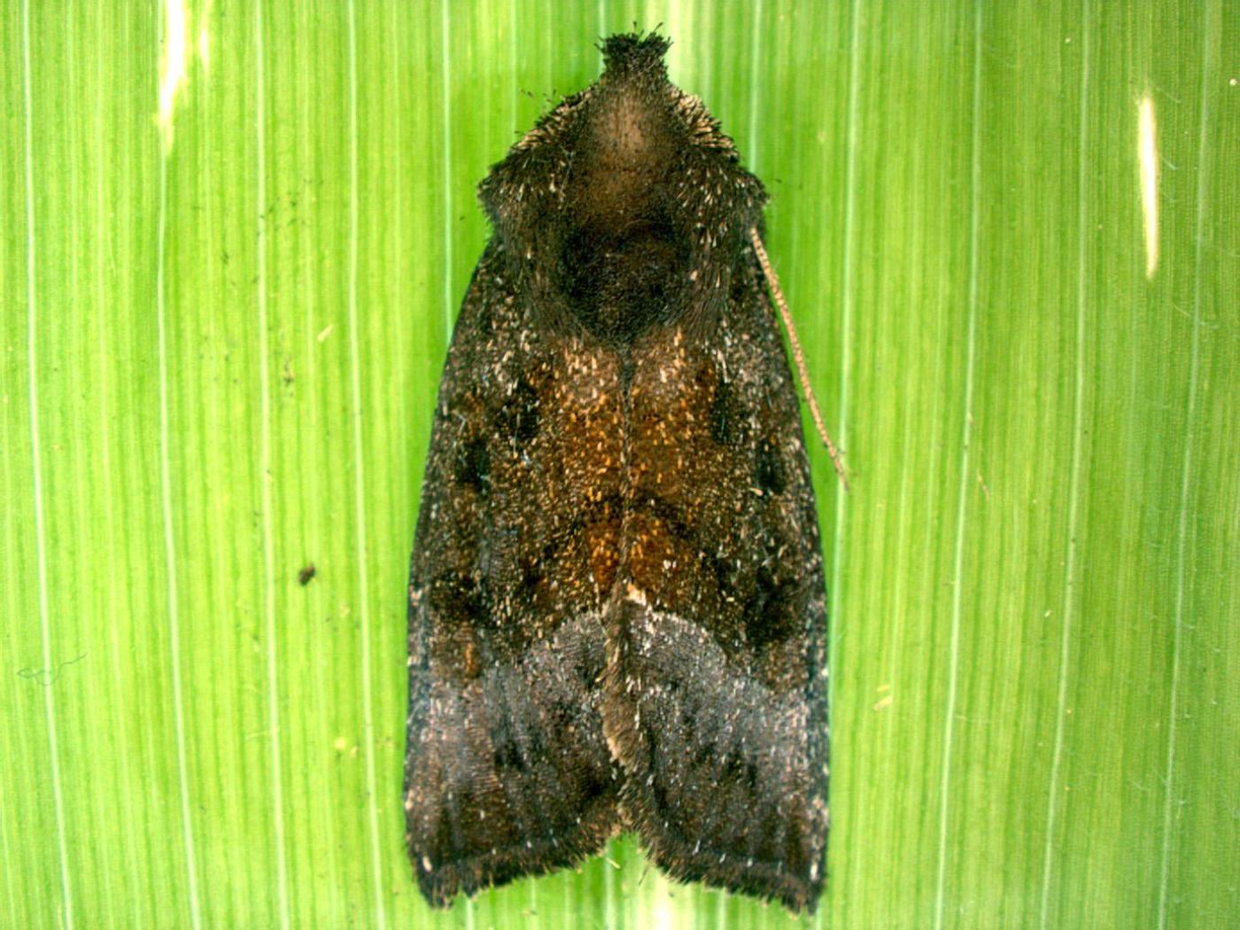 Adulte : envergure des ailes de 25,0 à 40,0 mm; la tête et le thorax sont ornés de soies dressées; les ailes sont brun foncé avec des taches noires ou blanches dans la portion centrale; l’extrémité apicale des ailes antérieures est gris cendré.