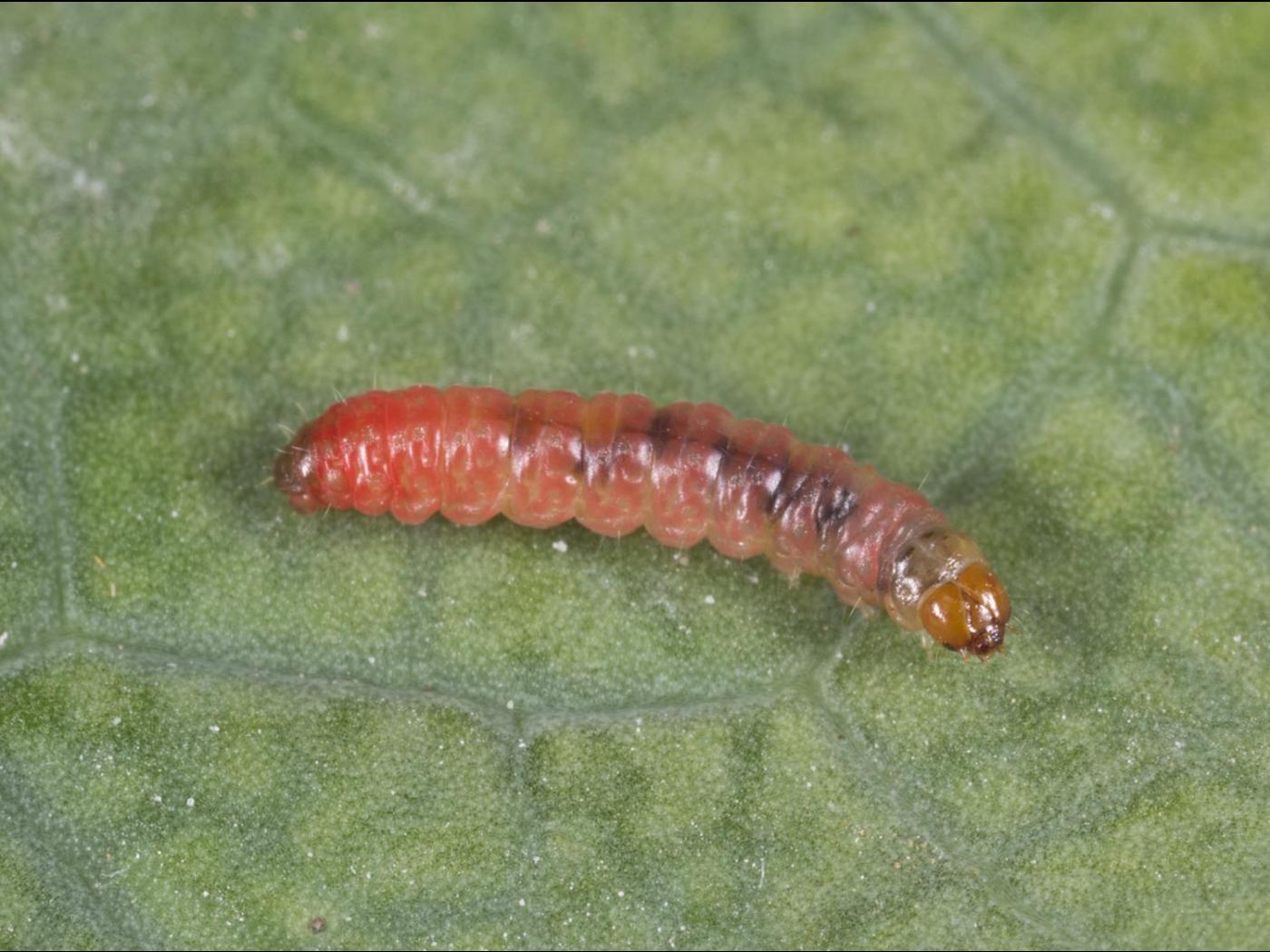 Larve : 8,0 mm à maturité; la tête est brun pâle et le corps est rosé; la plaque thoracique est jaunâtre et la plaque anale est brunâtre; trois soies latérales sont présentes sur le premier segment thoracique, ce qui permet de distinguer les Tordeuses (Tortricidae) des Pyrales (Pyralidae).